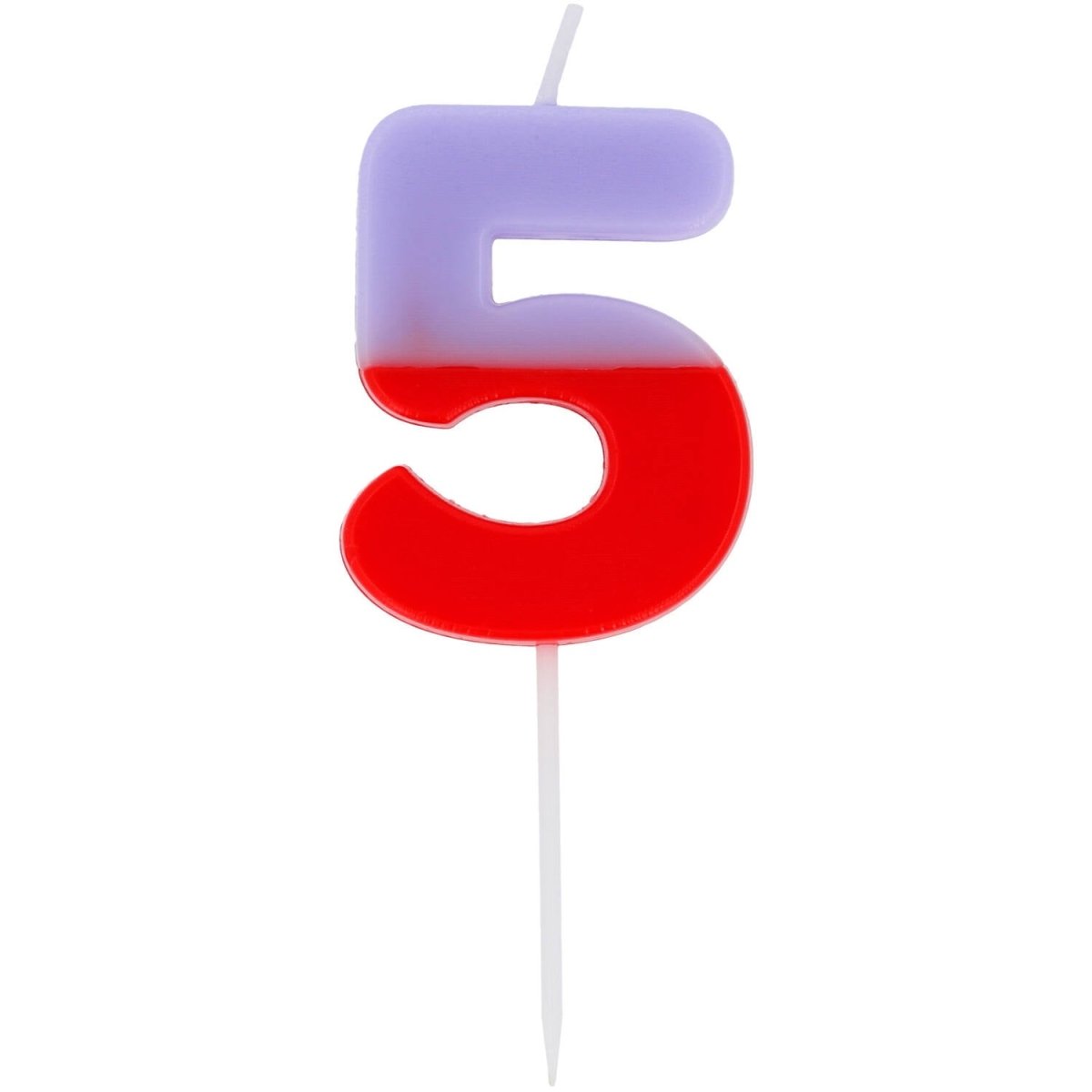 Jako uczta na torcie! Świeczka - Stripetastic - Numer 5. Zawartość: 1 świeczka numeryczna. Do wykorzystania na przykład podczas następujących przyjęć/imprez okolicznościowych: Urodziny, Przyjęcie dla dzieci, Rocznica. Ta świeczka ma kształt cyfry "5". Górna część jest liliowa, a dolna czerwona. Świeczka ma około 5 cm wysokości i 8 mm grubości. Całkowita długość świecy (łącznie z nakłuwaczem, bez knota) wynosi około 9 cm. Ten artykuł jest wykonany z wosku.