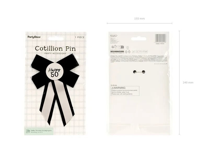 Button na 50-lecie w kolorze kremowo-czarnym, wymiary ok. 11 x 17 cm. Do guzika dołączona jest agrafka.