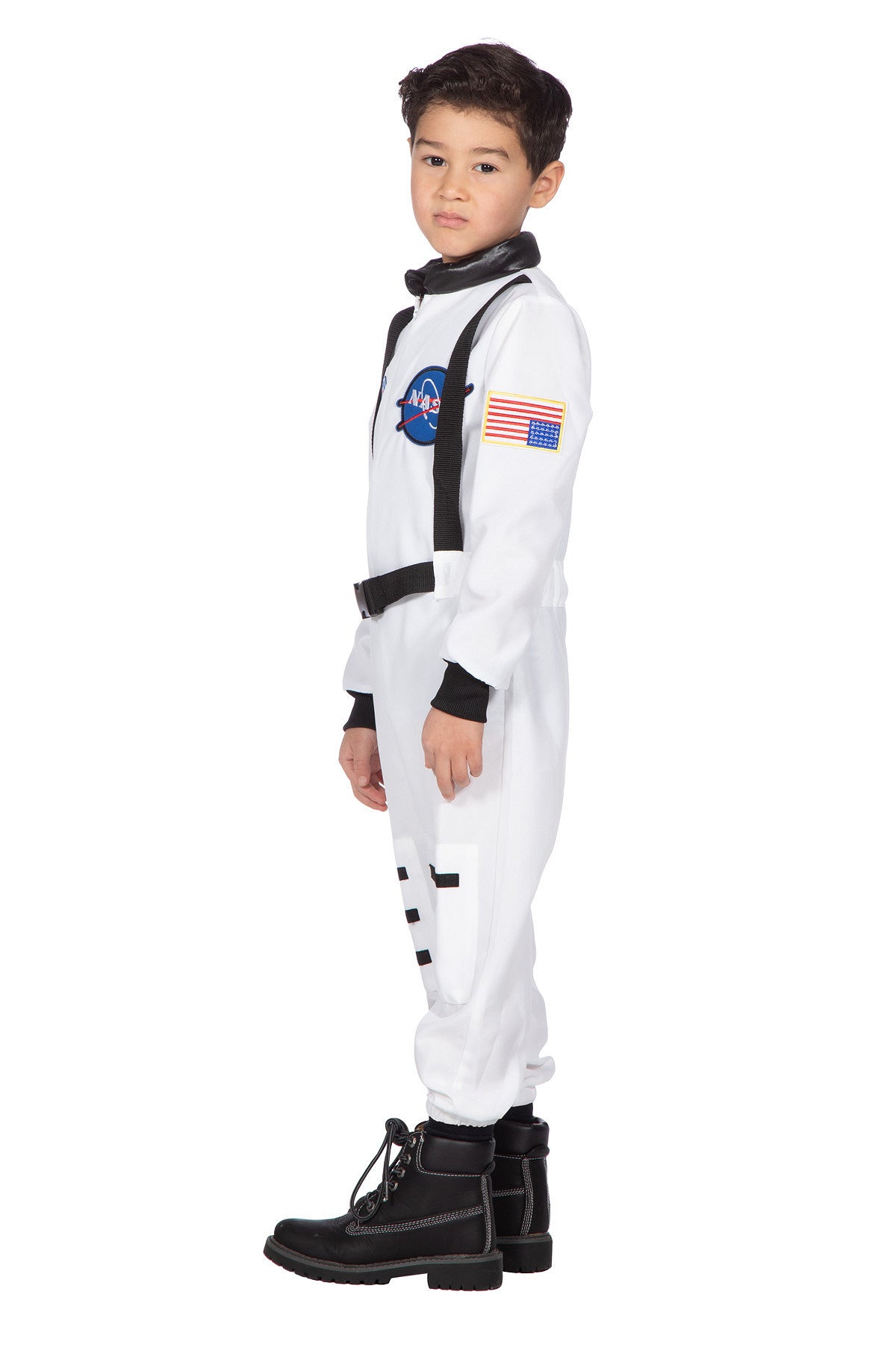 Fajny kombinezon astronauty dla chłopców w kolorze białym z czarnymi i niebiesko-czerwonymi detalami. Idealny na przebierane przyjęcia, imprezy tematyczne lub zabawy z wyobraźnią.