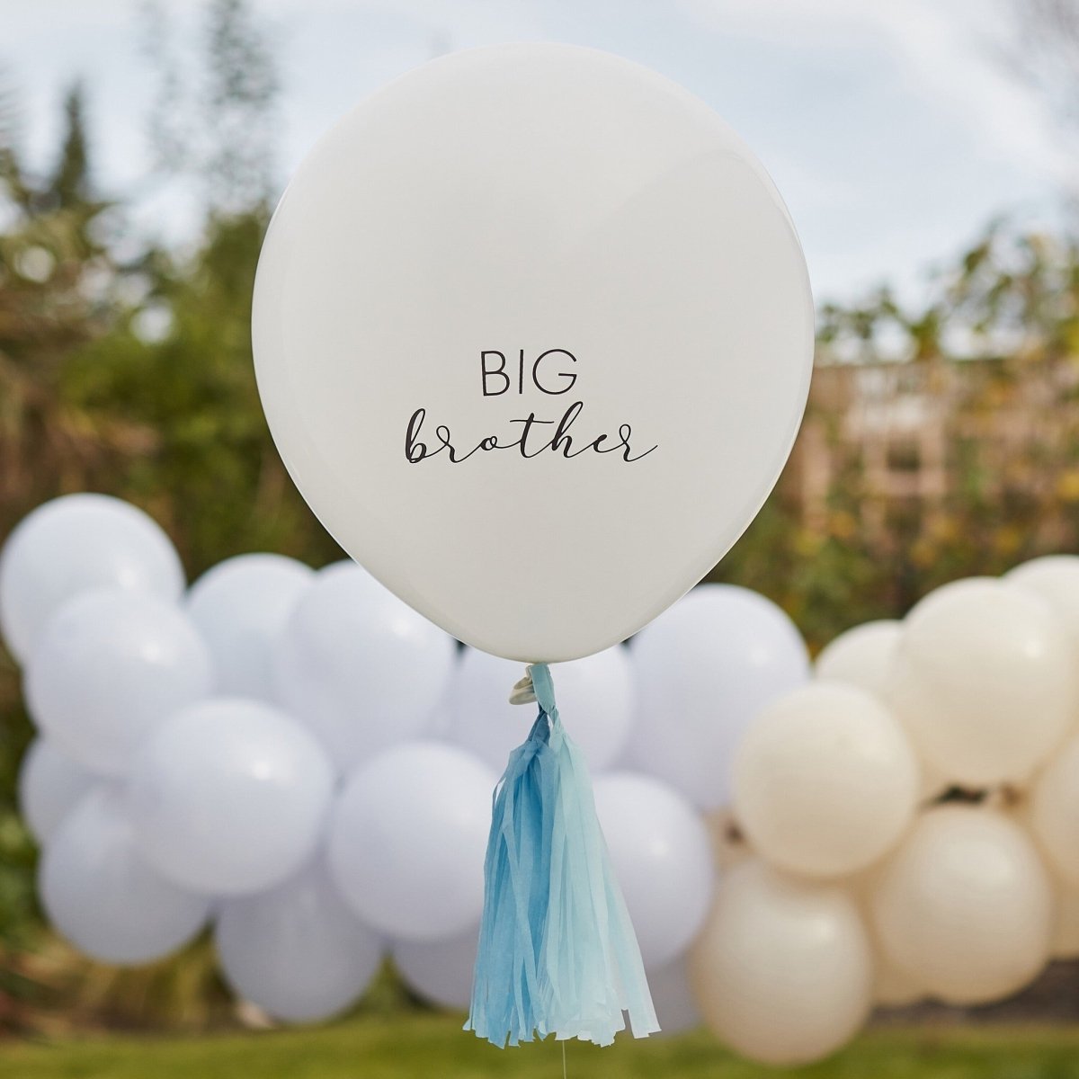 Ogłoś swoją ciążę i obdarz nowego starszego brata miłością dzięki naszemu balonowi Big Brother z niebieskimi frędzlami
