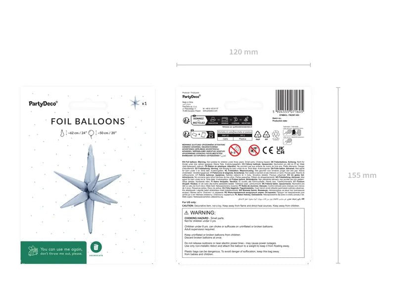 Balon foliowy oszroniony 3D Star w kolorze mglistego błękitu, wymiary przed nadmuchaniem ok. 53 x 62 cm (21 x 24''), wymiary po nadmuchaniu ok. 50 cm (20''). Napompuj powietrzem. Zestaw zawiera słomkę.