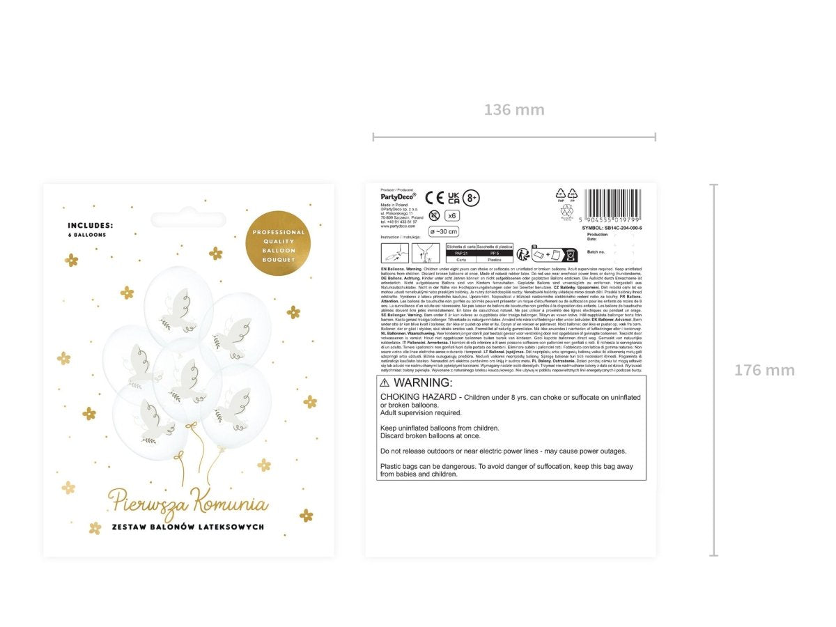 Mocne balony gołębie, zestaw zawiera 6 balonów w krystalicznie czystym kolorze z kolorowym dwustronnym nadrukiem, średnica ok. 30 cm.
