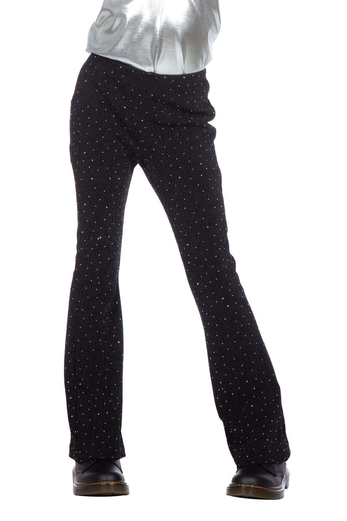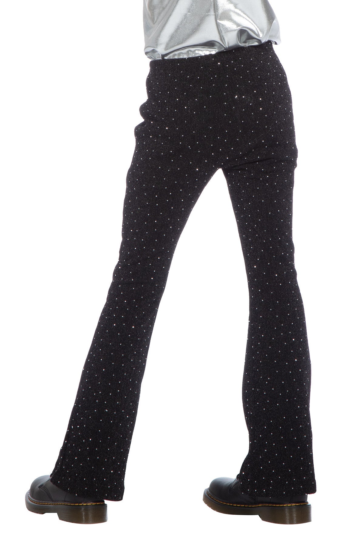 Spraw, by każdy strój był odświętny dzięki tym czarnym brokatowym rozkloszowanym spodniom. Idealne na imprezy tematyczne, karnawały lub efektowny imprezowy look.