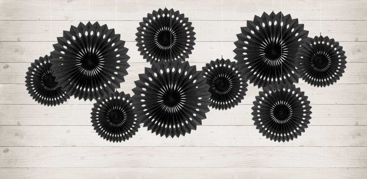 Rozety dekoracyjne wykonane z bibuły w kolorze czarnym, średnice razem ok. 20 cm, 25 cm i 30 cm. Produkt wielokrotnego użytku. Mocowanie za pomocą klipsa. 3 sztuki.