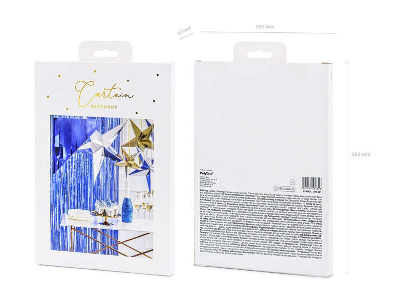 Zawartość: Kurtyna imprezowa, niebieska, szerokość ok. 90 cm, wysokość ok. 250 cm.