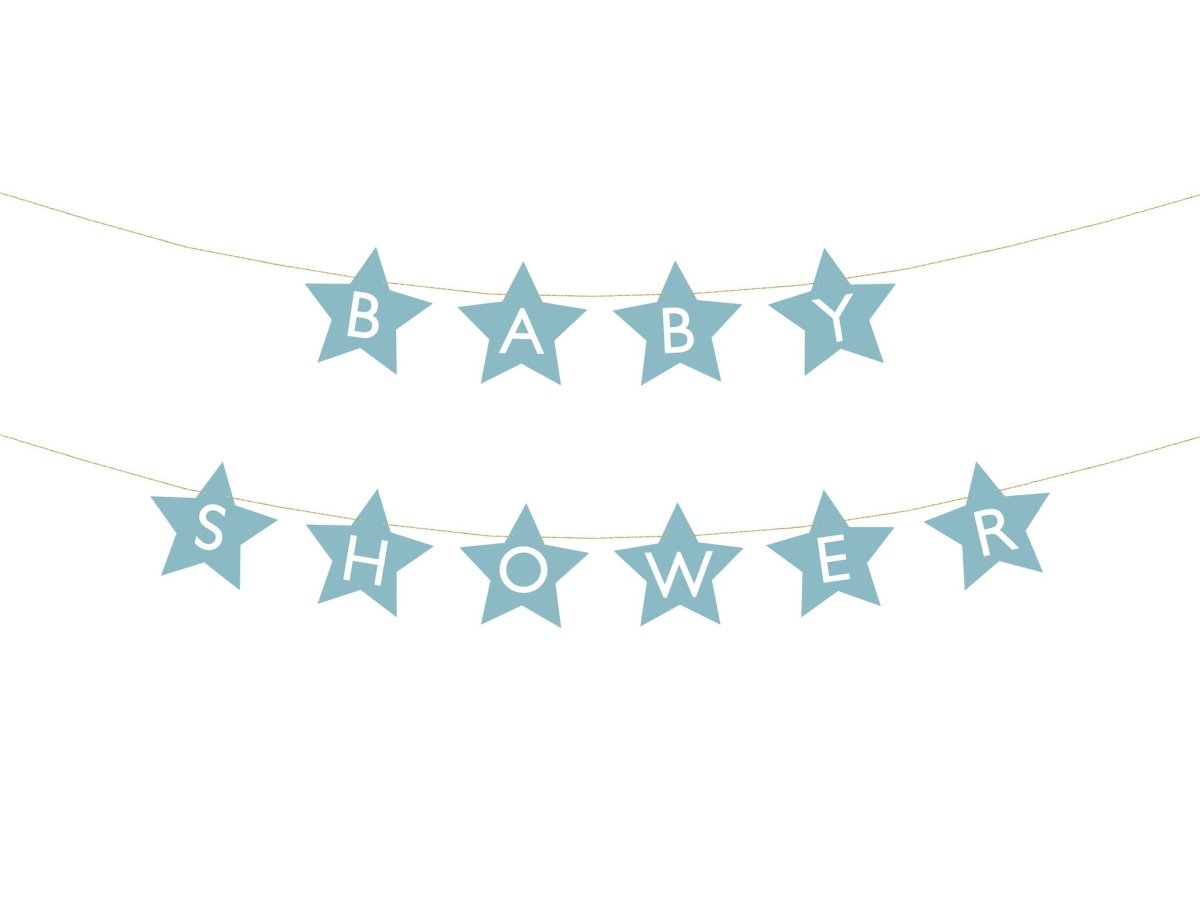 Baner w kształcie gwiazdy z napisem Baby Shower, wykonany z jasnoniebieskiego papieru, długość liny ok. 3 m.