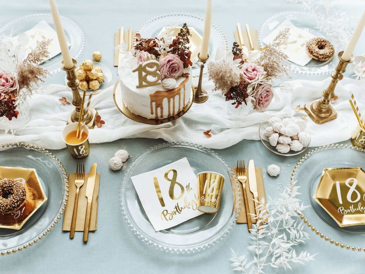 Zawartość: Papierowe talerzyki w kolorze złotym metalicznym z białym napisem 18th Birthday !, wym. 20 x 17 cm. (1 PKT/6 szt.)