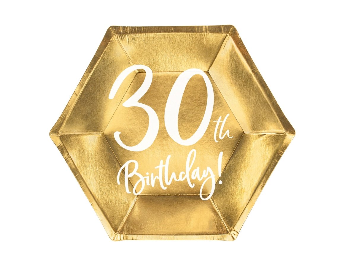 Zawartość: Talerzyki papierowe w kolorze złotym metalicznym z białym napisem 30th !, rozmiar: 20 x 17 cm. (1 PKT/6 szt.)
