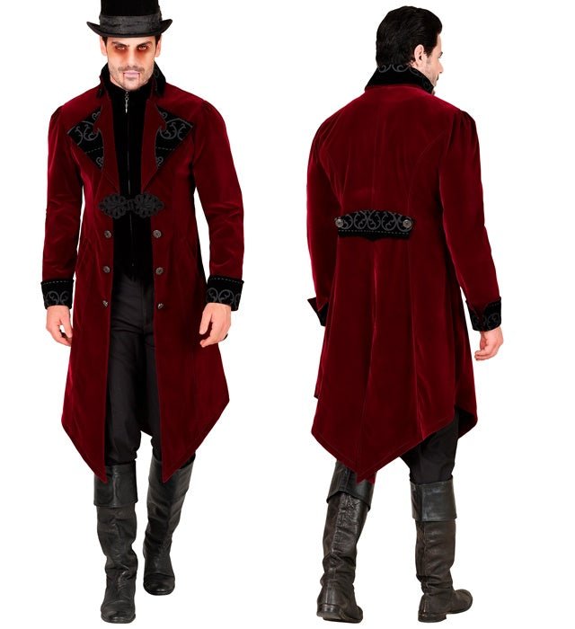 Dzięki tej bordowej aksamitnej gotyckiej kurtce dla mężczyzn natychmiast stworzysz elegancki, tajemniczy i przyciągający wzrok wygląd.