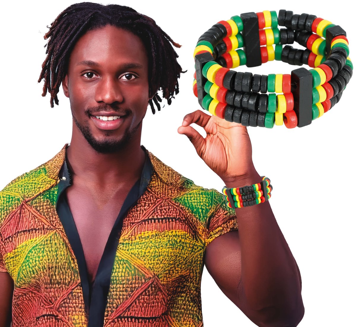 Modna bransoletka w stylu Rasta wykonana z drewna w charakterystycznych kolorach czarnym, żółtym i zielonym. Idealna, aby nadać Twojemu strojowi wesoły i kolorowy akcent lub jako dodatek na imprezy tematyczne i festiwale.