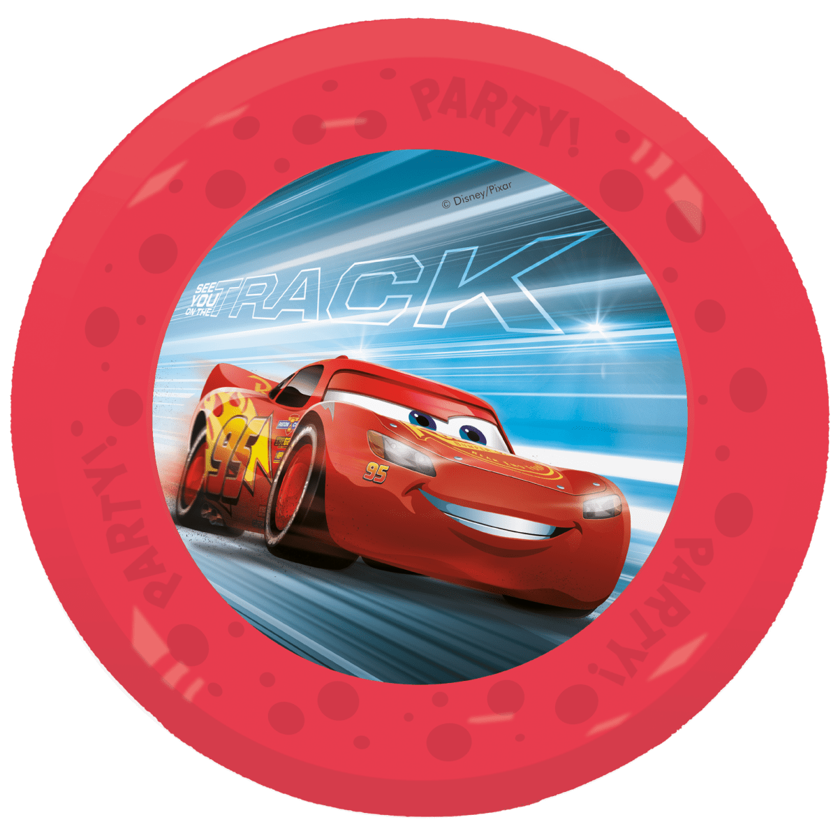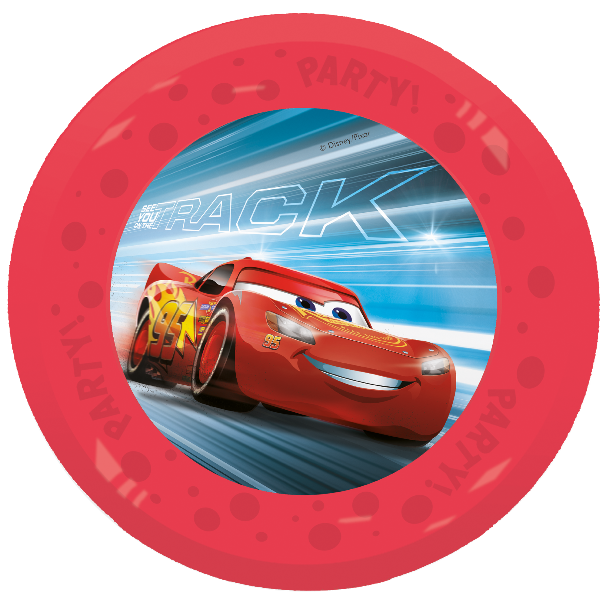 Wytrzymałe plastikowe talerzyki z motywem Cars, idealne na przyjęcia dla dzieci, poczęstunki lub inne posiłki, podczas których Zygzak McQueen będzie królował. Talerze mają średnicę 21 cm i są dostępne w kolorach czerwonym i niebieskim.