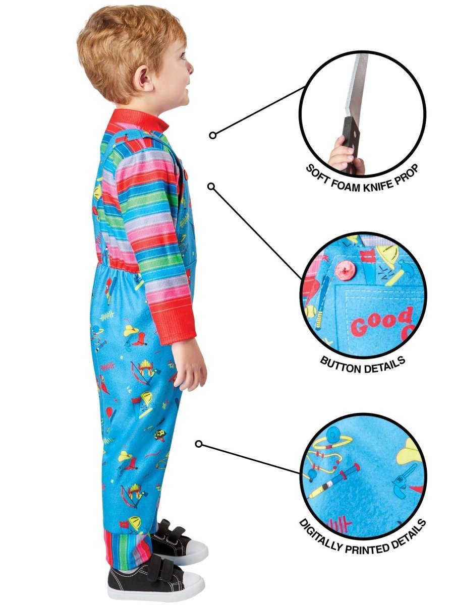 Ten oficjalnie licencjonowany kostium Chucky dla maluchów przekształci Twojego malucha w mini wersję kultowej postaci z kultowego klasyka. Zainspirowany słynnym strojem "Good Guy", kostium z pewnością przyciągnie wzrok na imprezach tematycznych, balach przebierańców lub Halloween.