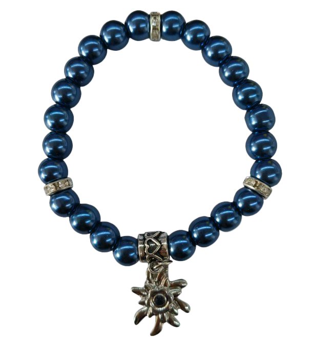 Dodaj elegancki akcent do każdego stroju dzięki tej ciemnoniebieskiej bransoletce z perłami i szarotką. Stylowy design sprawia, że bransoletka nadaje się do noszenia na co dzień lub jako wyjątkowy prezent.