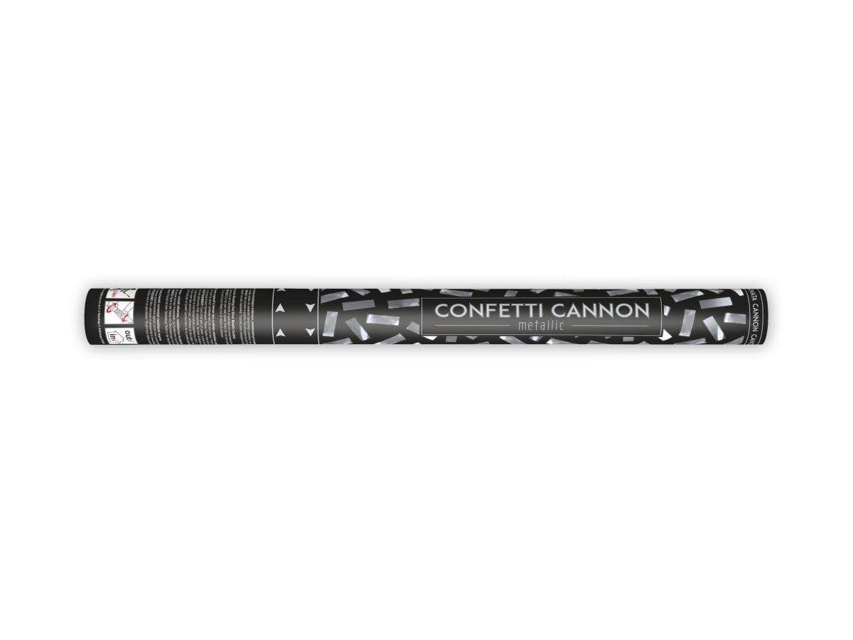 Zawartość: Armatka konfetti wystrzeliwująca metalowe konfetti, srebrna, długość 60 cm.
