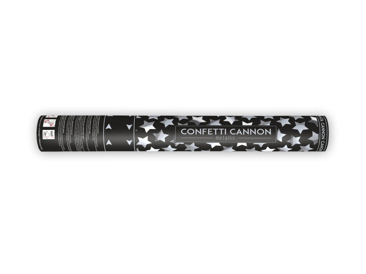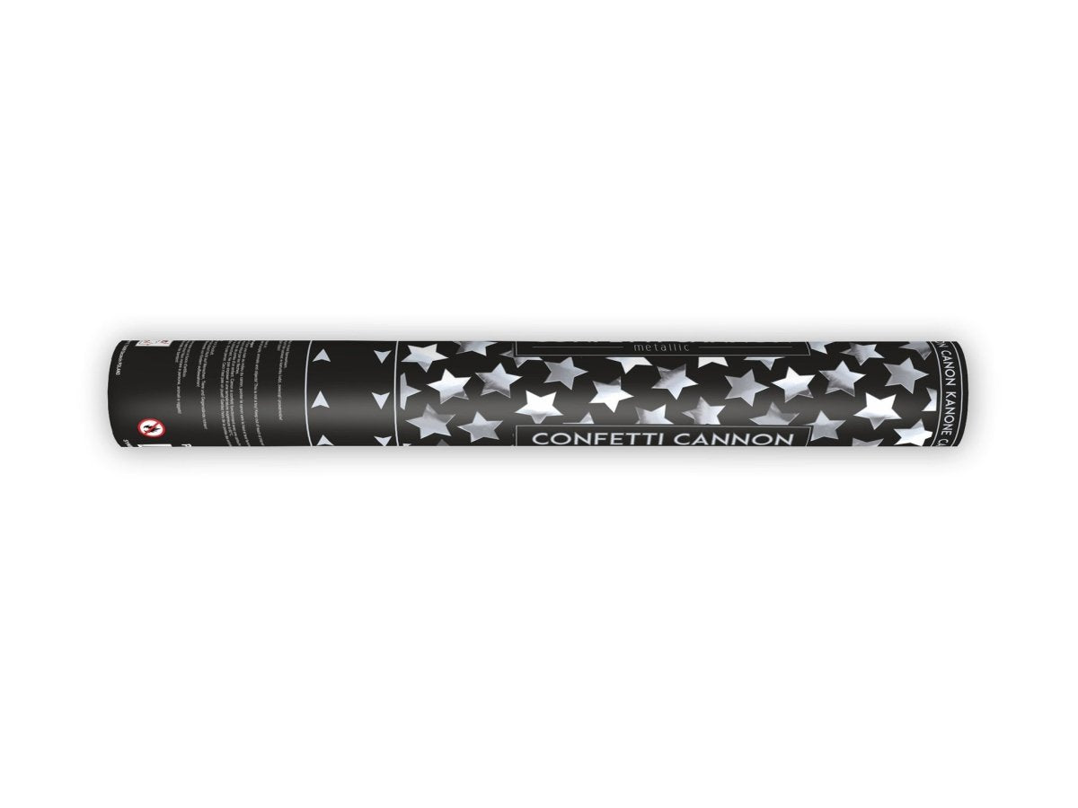 Zawartość: Konfetti Cannon wystrzeliwujące metaliczne gwiazdki, srebrne, długość 40 centymetrów.