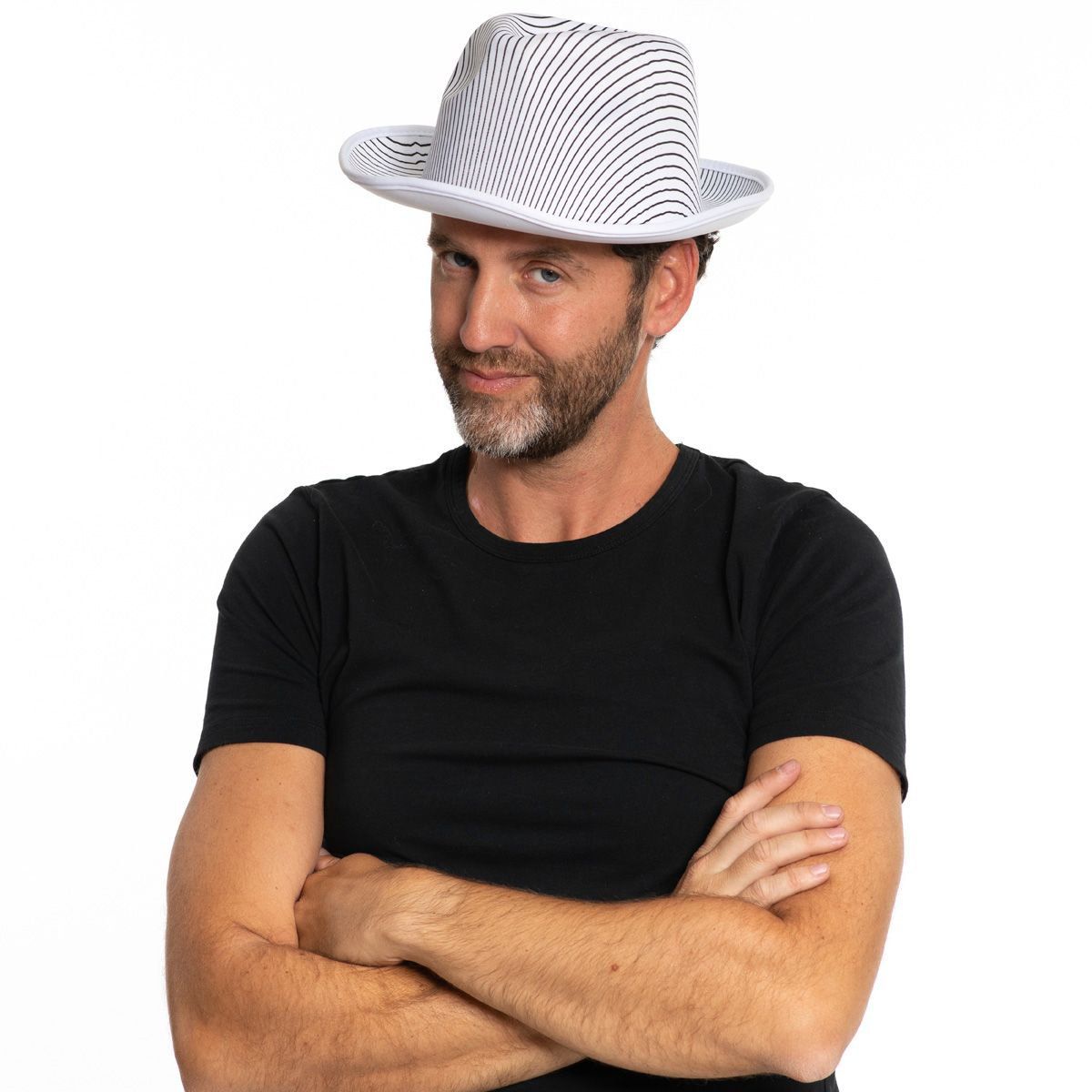 Kapelusz gangstera w białe paski to stylowy i przyciągający wzrok dodatek, który idealnie pasuje do strojów gangsterskich, z lat 20. i tematycznych. Satynowe wykończenie nadaje kapeluszowi luksusowy wygląd, idealny na karnawał i inne okazje do przebierania się.