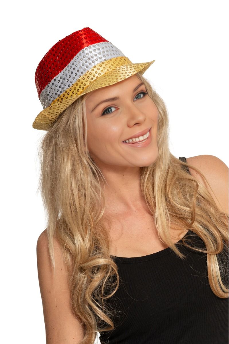 Czerwony biały żółty kapelusz z cekinami i światłem