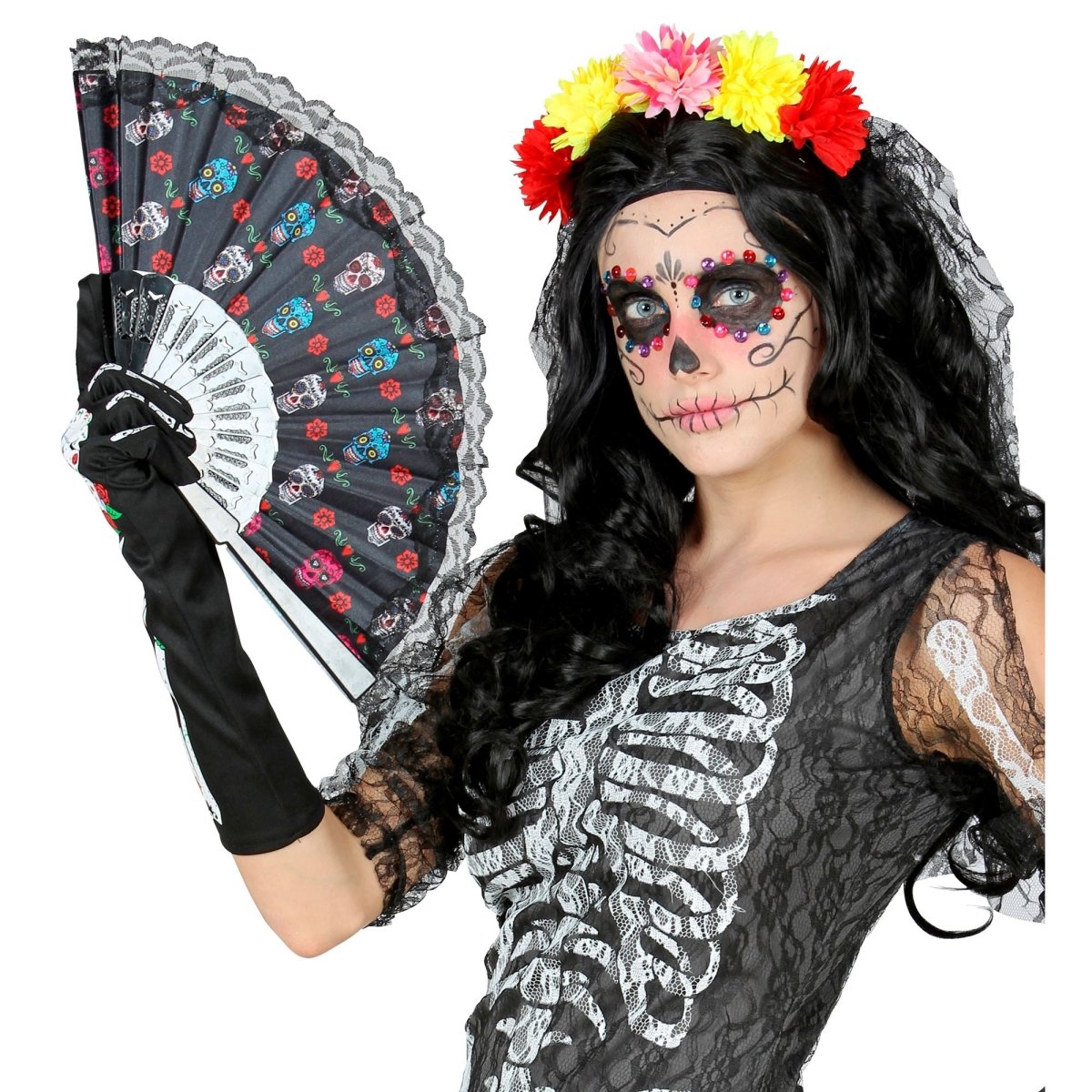 Wesoły wachlarz inspirowany Dia de Los Muertos, idealny jako świąteczna dekoracja lub dodatek na imprezy tematyczne.