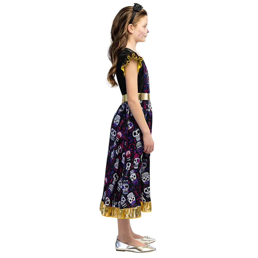 Świętuj Día de los Muertos w wielkim stylu dzięki temu kolorowemu kostiumowi z okazji Dnia Zmarłych! Sukienka jest przeznaczona dla dziewczynek i ma nadruk czaszki oraz złote detale, a także diadem i pasek. To idealny strój na Halloween lub imprezę o tematyce meksykańskiej. Odświętny strój z nutką tajemniczości!