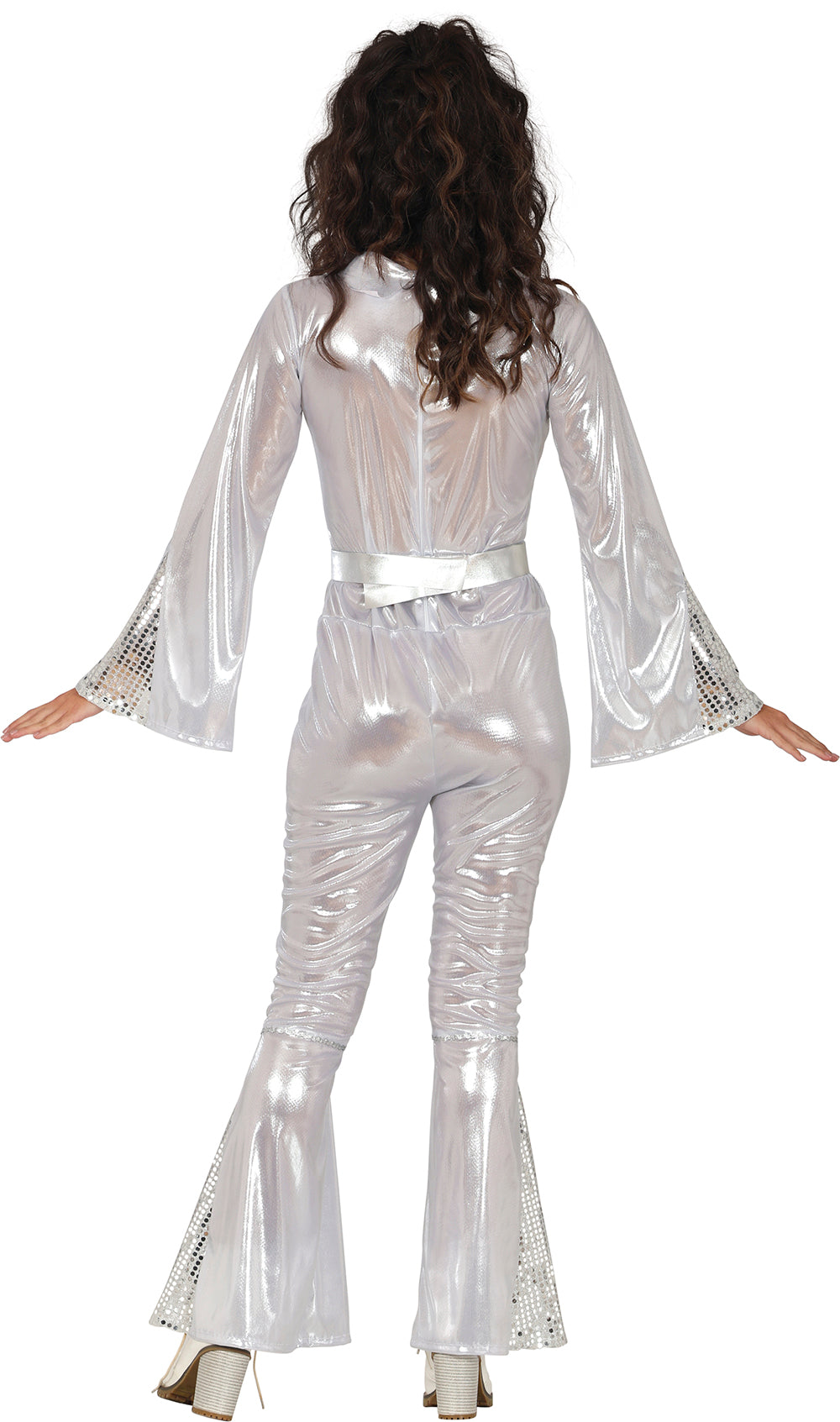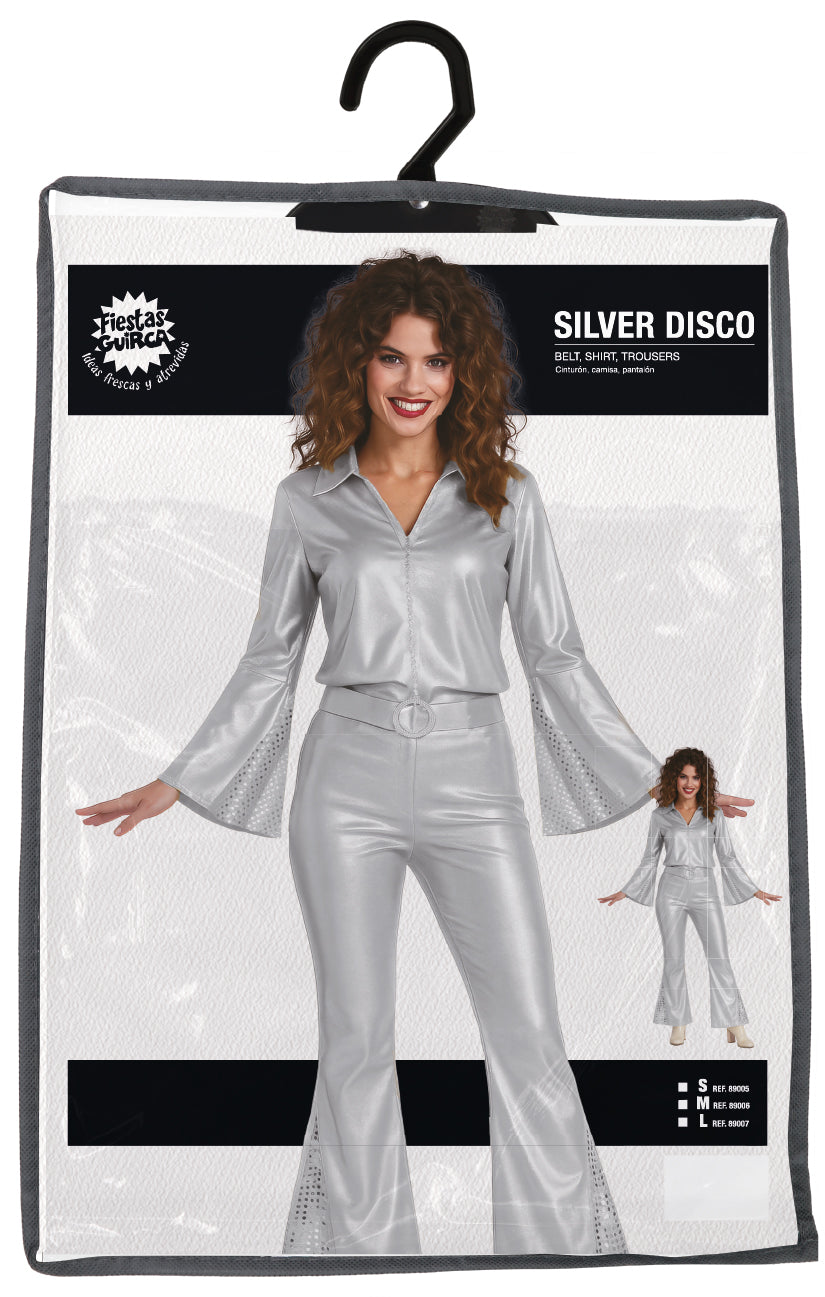 Kostium Disco Suit Silver Ladies - 3-częściowy przyciąga wzrok każdego, kto chce zabłysnąć na imprezie disco, karnawale lub zabawie. Dzięki błyszczącemu srebrnemu wyglądowi i wygodnemu dopasowaniu, ten kostium jest idealny na noc tańca i zabawy.