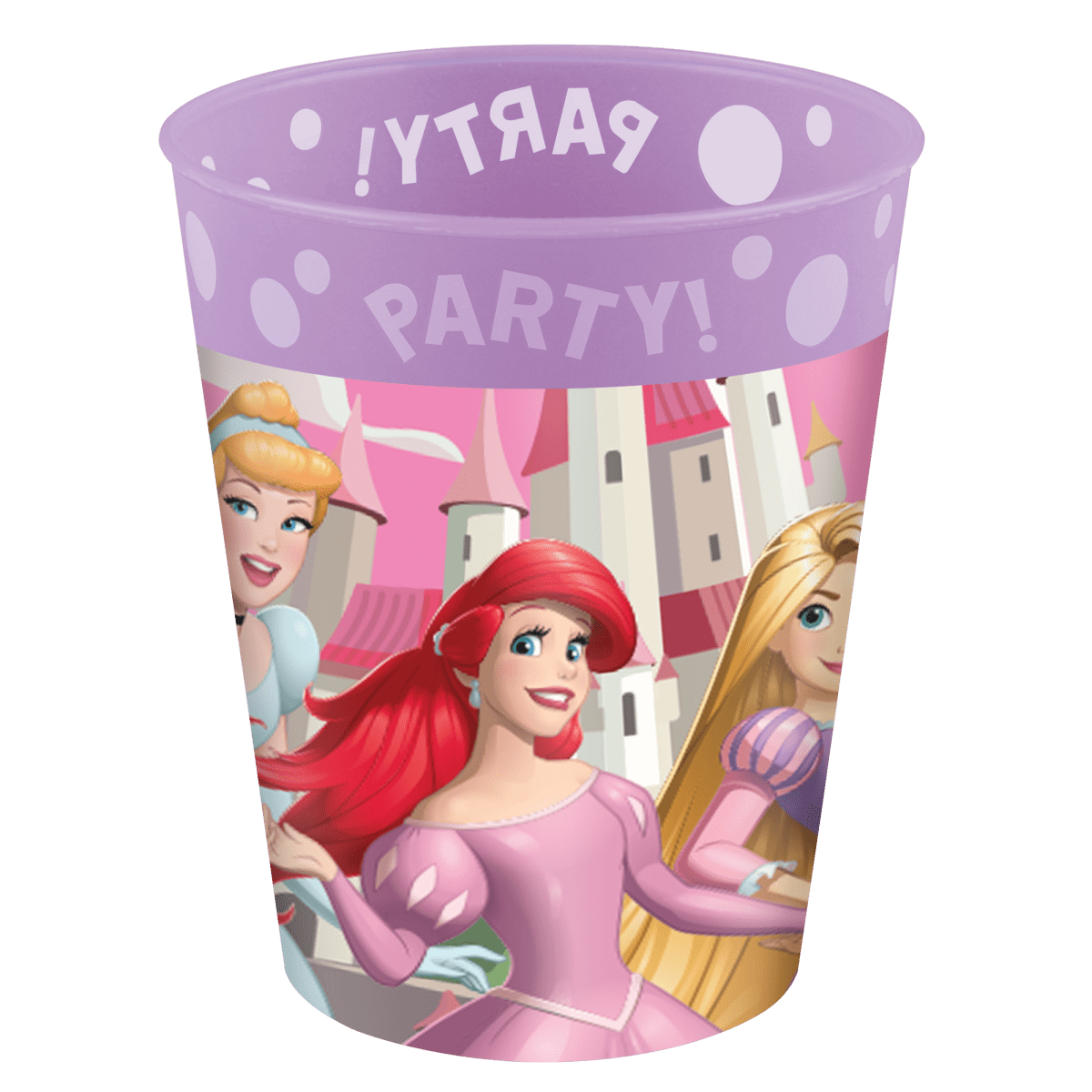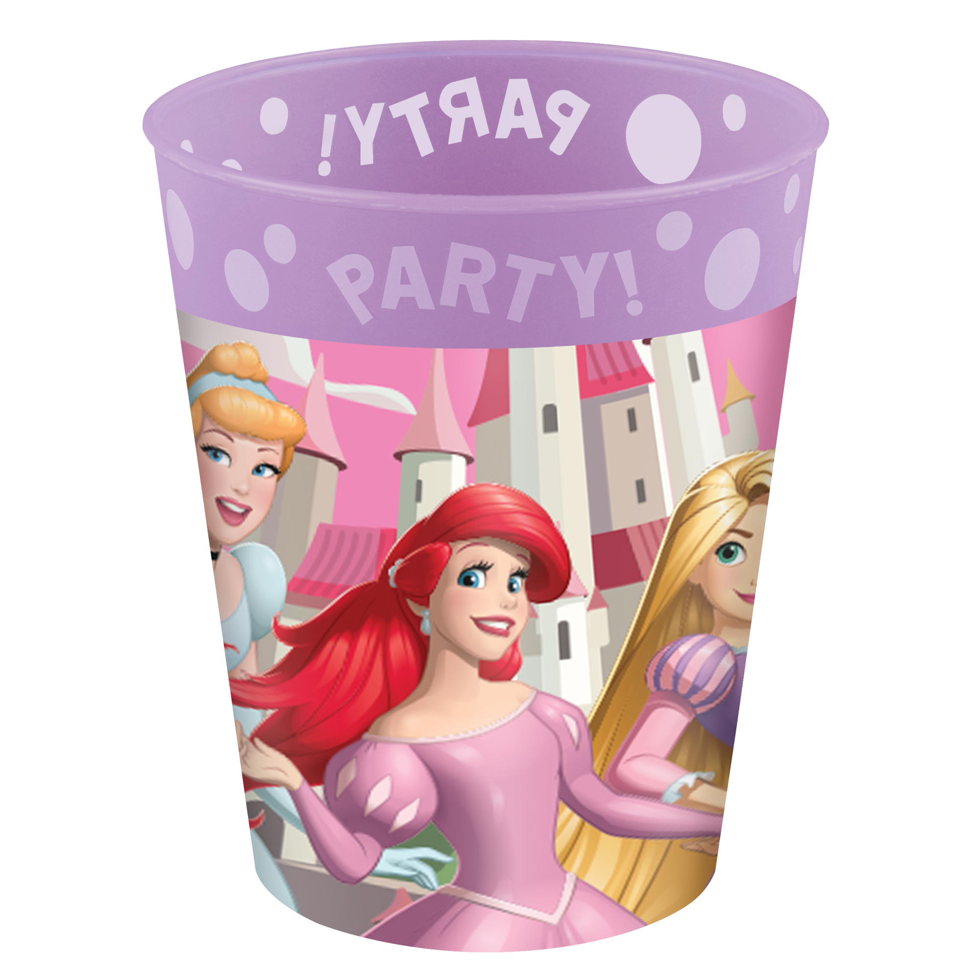 Wesołe fioletowe kubki z nadrukiem księżniczek Disneya. Idealne na przyjęcia dla dzieci, przebierane imprezy lub do codziennego użytku. Wytrzymała jakość plastiku sprawia, że są wielokrotnego użytku i nadają się do różnych napojów.
