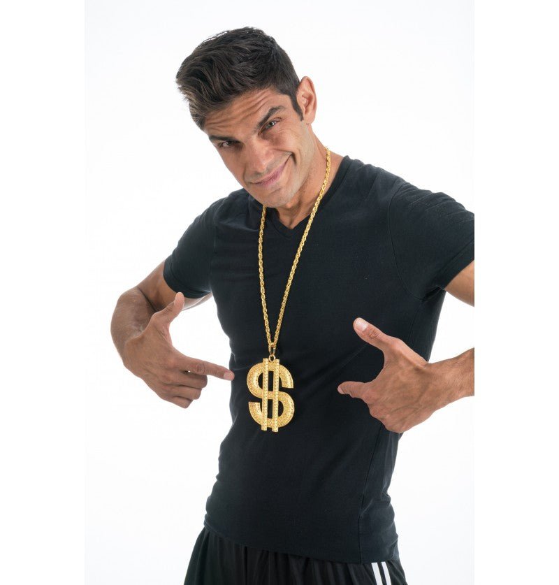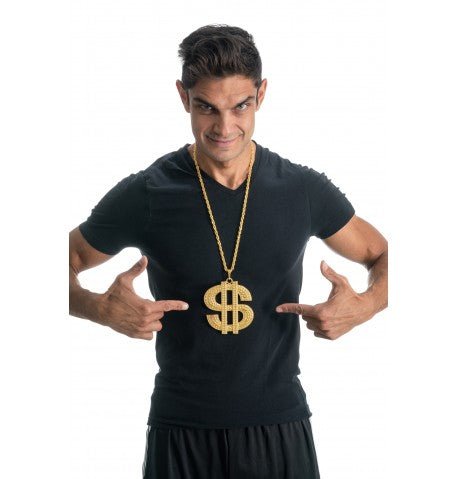 Uzupełnij swój hip-hopowy lub gangsta look tym przyciągającym wzrok naszyjnikiem o długości 100 cm z dużym znakiem dolara o wymiarach 11 x 10 cm wykonanym z metalu, idealnym na imprezy tematyczne, bale przebierańców lub festiwale