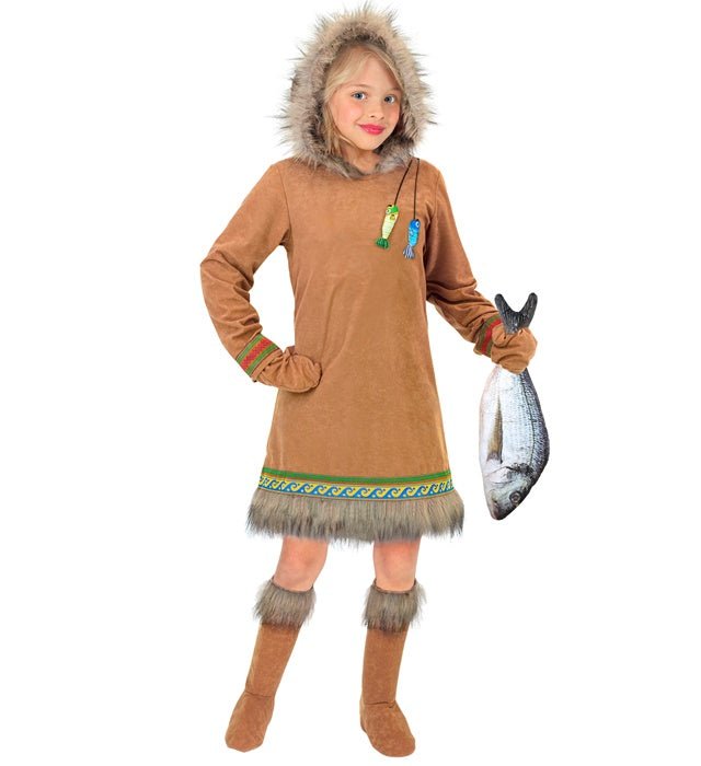 Zapewnij swojej małej poszukiwaczce przygód zimowy klimat dzięki temu kompletnemu kostiumowi Eskimoski. Zestaw zawiera sukienkę z kapturem, pasujące rękawiczki i buty. Idealny na karnawał, imprezy tematyczne lub przebierane, dzięki czemu jest wygodny i uroczy do przebrania.