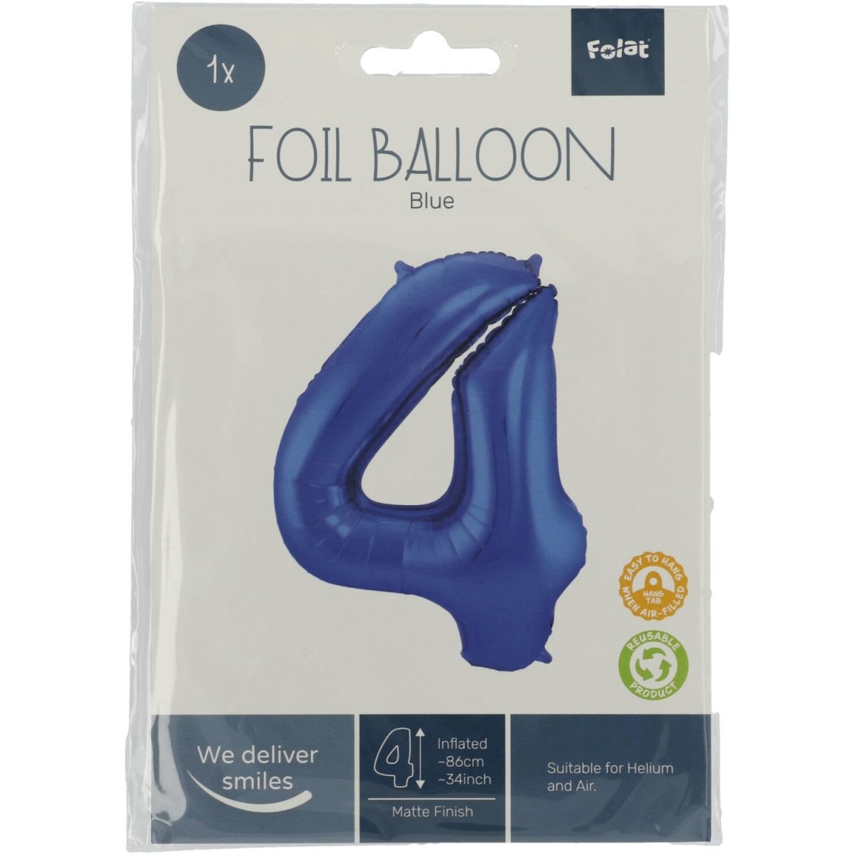 Piękny duży balon foliowy cyfra 4 w metalicznym matowym niebieskim kolorze. Zawartość: 1 balon foliowy o długości 86 cm. Kolor: niebieski. Balon posiada poręczne zawieszki, dzięki czemu można go łatwo zawiesić. Do wykorzystania na przykład podczas następujących przyjęć/imprez okolicznościowych: Urodziny, Przyjęcie dla dzieci i Rocznica. Ten balon foliowy mierzy 34 cale/86 cm. Produkt jest wykonany z folii