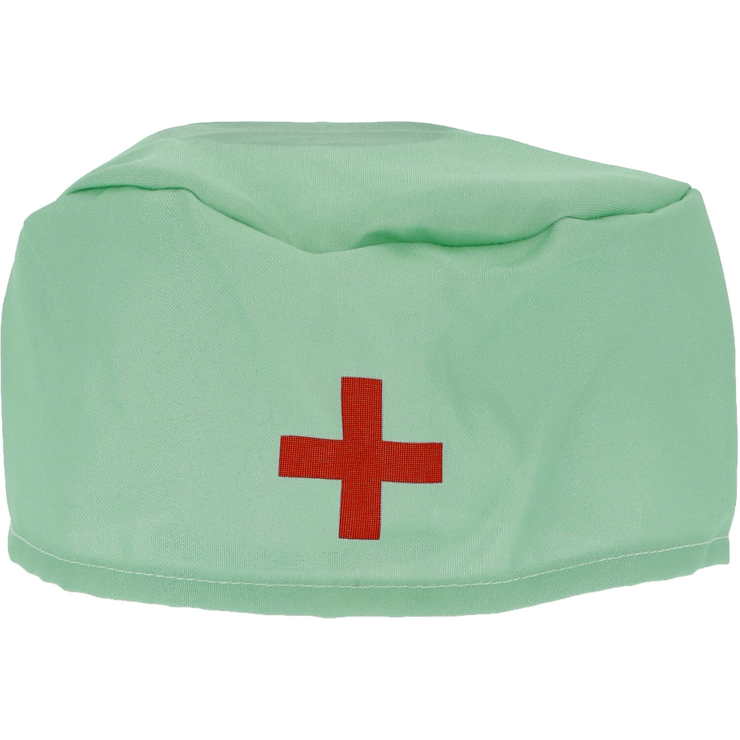 Jasnozielona czapka z czerwonym krzyżem medycznym pośrodku.