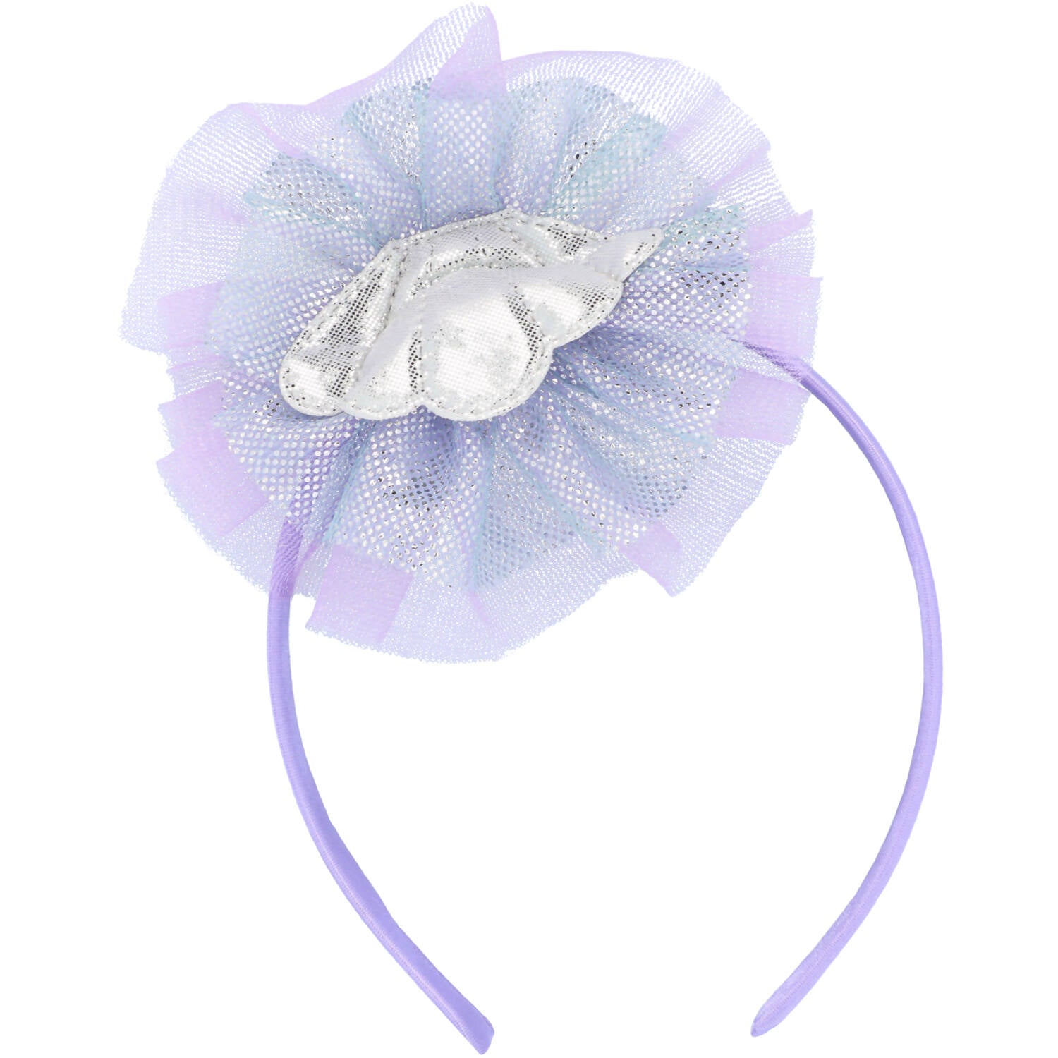 Talia wykończona opalizującym tiulem w kształcie litery V, centralnie wiązana opalizującym plastikowym kamieniem