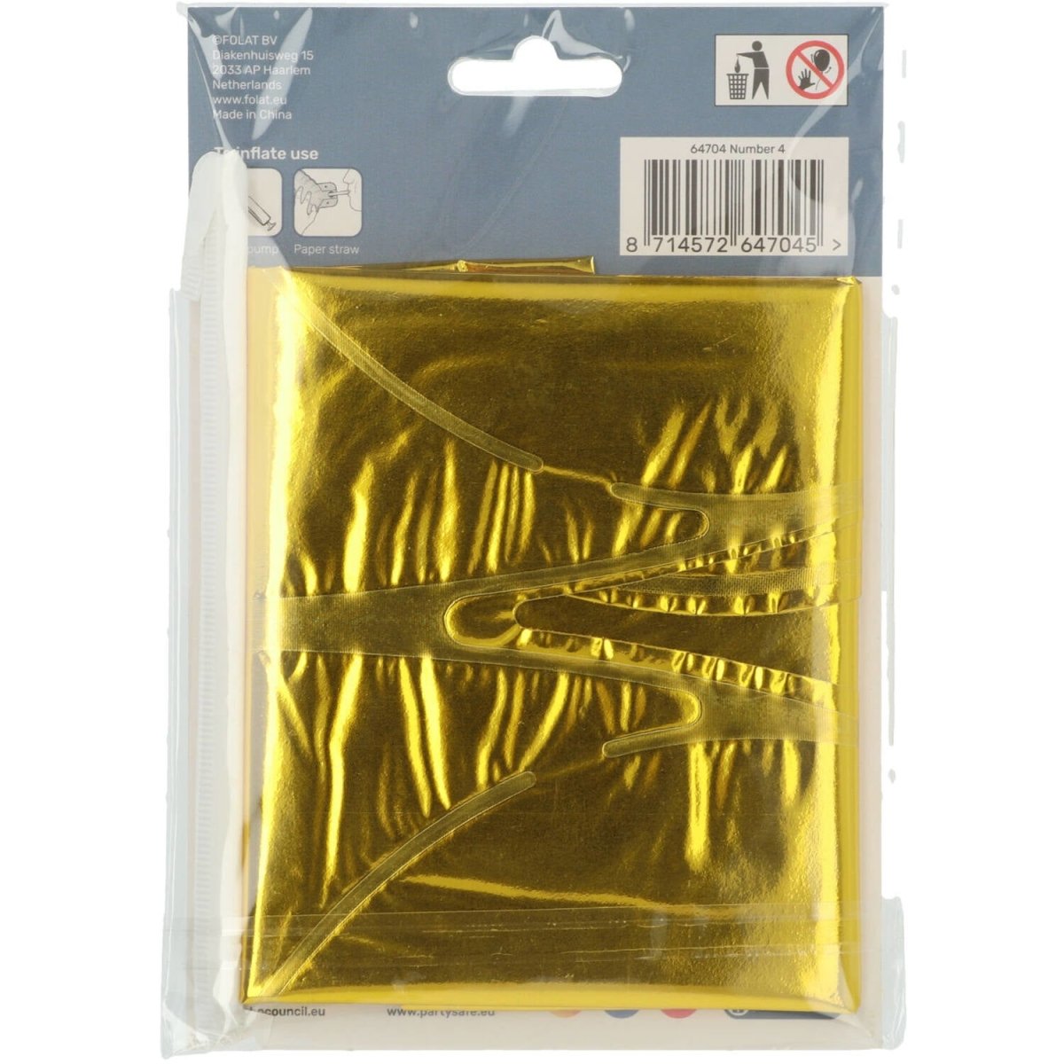 Balon foliowy Figurka 4 Złoty Kolor - 72 cm. Zawartość: 1 balon foliowy. Kolor: złoty. Do wykorzystania na przykład podczas następujących przyjęć/imprez okolicznościowych: Urodziny, Przyjęcie dla dzieci i Rocznica. Ten balon foliowy ma 28 cali/72 cm i może być napełniany powietrzem (hel nie jest potrzebny). Produkt jest wykonany z folii.