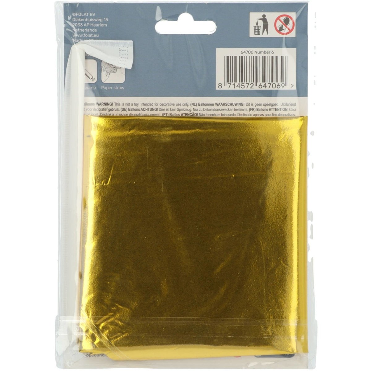 Balon foliowy Figurka 6 Złoty Kolor - 72 cm. Zawartość: 1 balon foliowy. Kolor: złoty. Do wykorzystania na przykład podczas następujących przyjęć/imprez okolicznościowych: Urodziny, Przyjęcie dla dzieci i Rocznica. Ten balon foliowy ma 28 cali/72 cm i może być napełniany powietrzem (hel nie jest potrzebny). Produkt jest wykonany z folii.