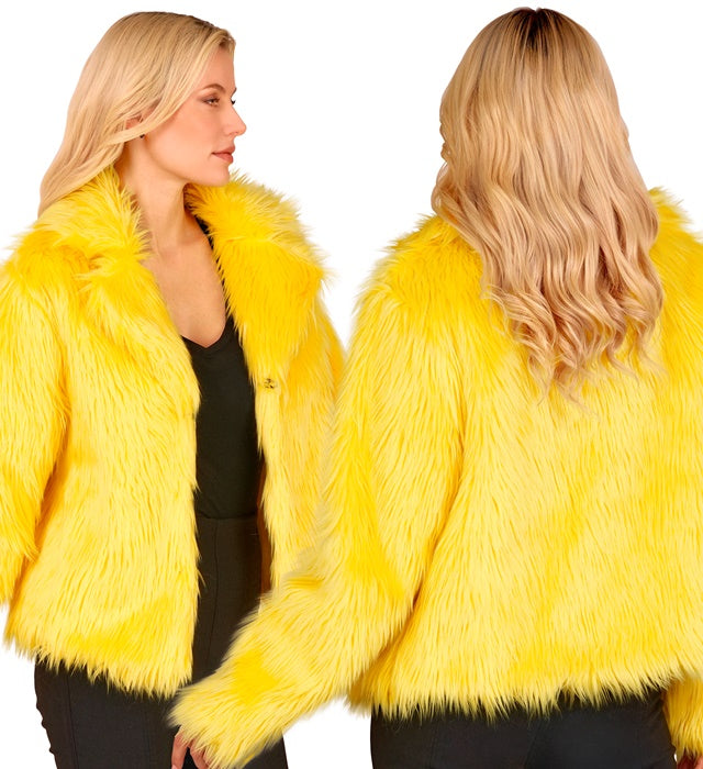 Ten pluszowy płaszcz futrzany dla kobiet w świeżym żółtym kolorze przyciąga wzrok na każdej imprezie. Idealny na karnawał, imprezy tematyczne, przyjęcia w stylu lat 80/90 lub złe przyjęcie.