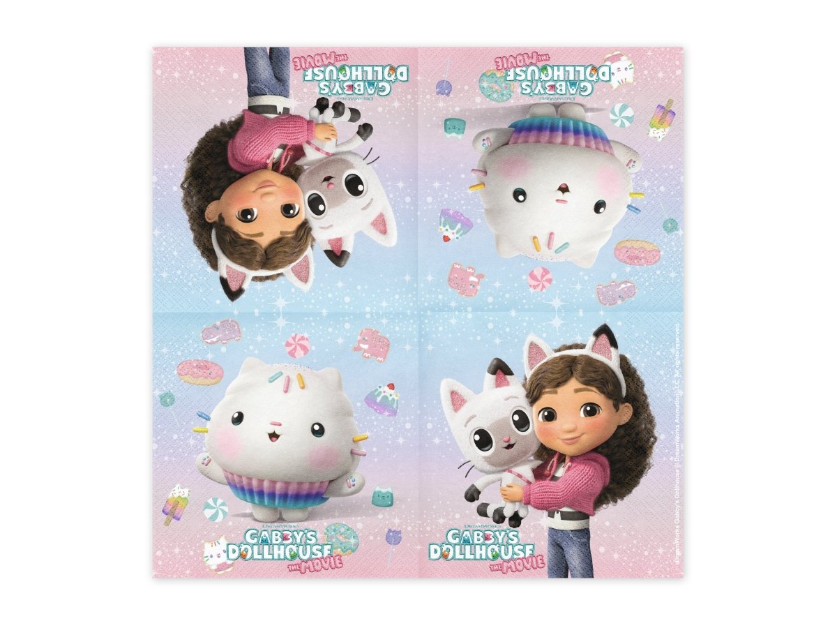 Serwetki mają wymiary ok. 33 x 33 cm po rozłożeniu i ok. 16,5 x 16,5 cm po złożeniu. Idealne na przyjęcia dla dzieci i imprezy tematyczne wokół domku dla lalek Gabby.