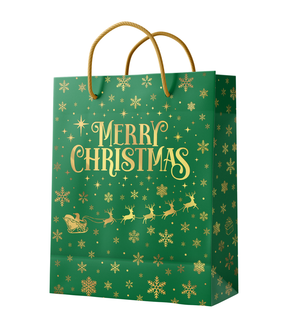 Zaskocz swoich gości świąteczną torbą na prezenty Wesołych Świąt w kolorze zielonym, z złotym nadrukiem i wesołymi motywami świątecznymi, takimi jak renifery, płatki śniegu i napis Wesołych Świąt. Idealna do stylowego pakowania prezentów, smakołyków lub drobnych niespodzianek w okresie świątecznym