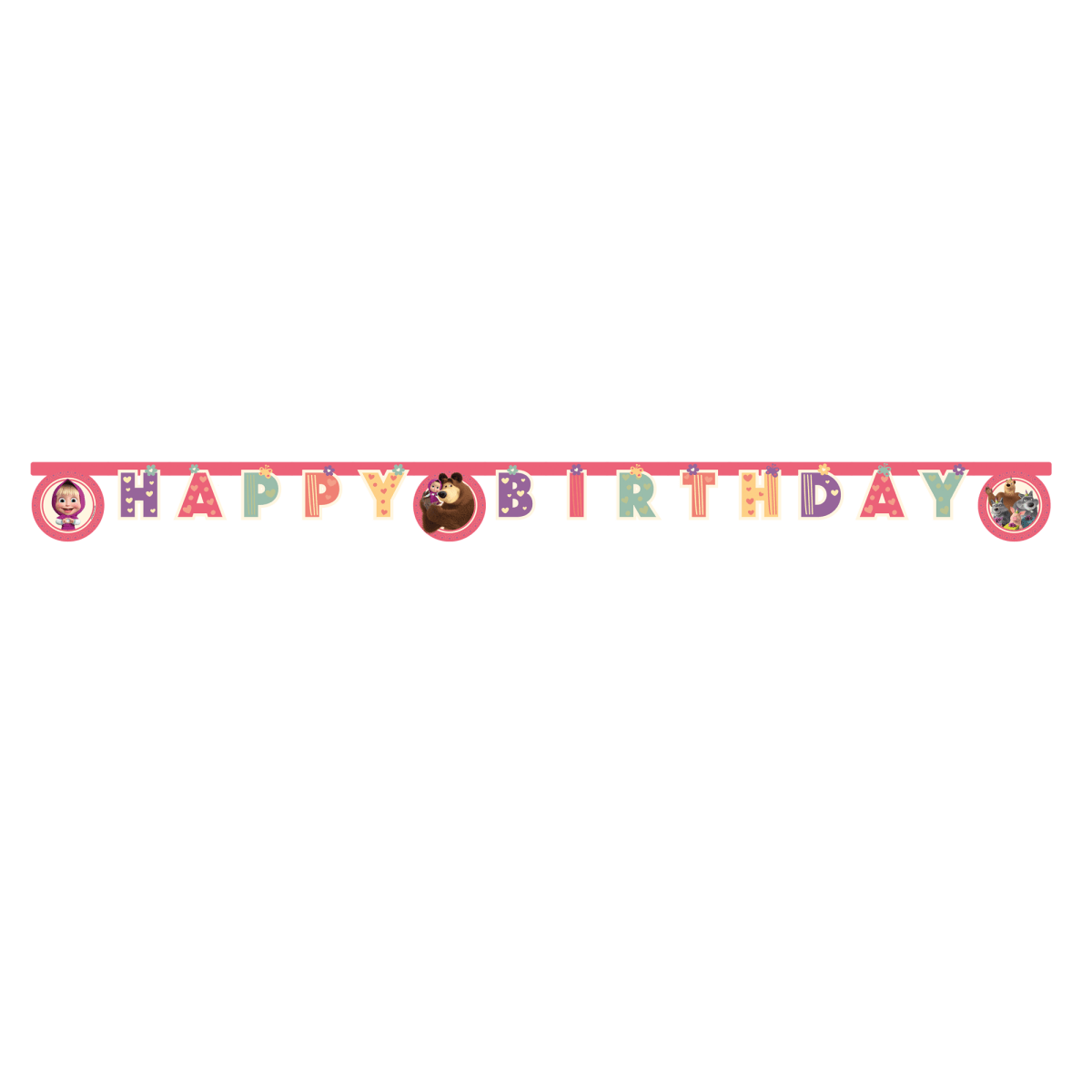Wesoła girlanda z literami Masha i Niedźwiedź, idealna do uświetnienia każdego przyjęcia urodzinowego lub dziecięcego. Dzięki kolorowemu nadrukowi ta girlanda natychmiast wprowadza radosną atmosferę do pokoju.