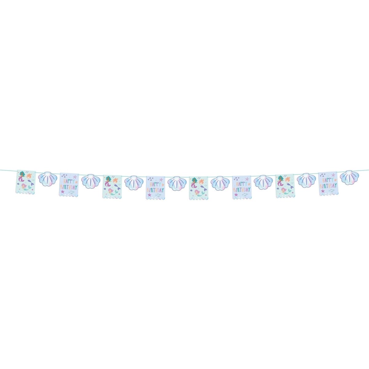 Mieniący się podwodny świat. Linka flagowa - Mermaid Magic - 6 metrów. Zawartość: 1 linka flagowa. Do wykorzystania na przykład podczas następujących przyjęć/imprez okolicznościowych: Impreza dla dzieci, Urodziny. Ta linka z flagami sprawi, że będzie to prawdziwe syrenie przyjęcie. Na tej 6-metrowej lince znajduje się 16 flag o wymiarach około 17 x 21 cm. Dostępne są 3 rodzaje flag: miętowo-zielona z trzema syrenkami i opalizującą krawędzią, paro-niebieska z napisem "HAPPY BIRTHDAY" i opalizującą krawędzią oraz w pełni opalizująca flaga w kształcie muszli, zapewniająca dodatkowy podwodny blask. Dzięki zastosowanej technice hot-stampingu opalizujące elementy naprawdę błyszczą! Flagi są drukowane dwustronnie. Można je przesuwać w tę i z powrotem po turkusowej wstążce. Ta linia flag należy do kolekcji Mermaid Magic autorstwa