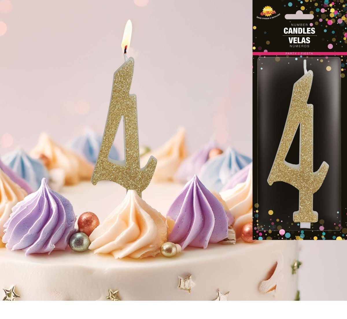 Złota świeczka na 4 lata z brokatem 12,5 cm