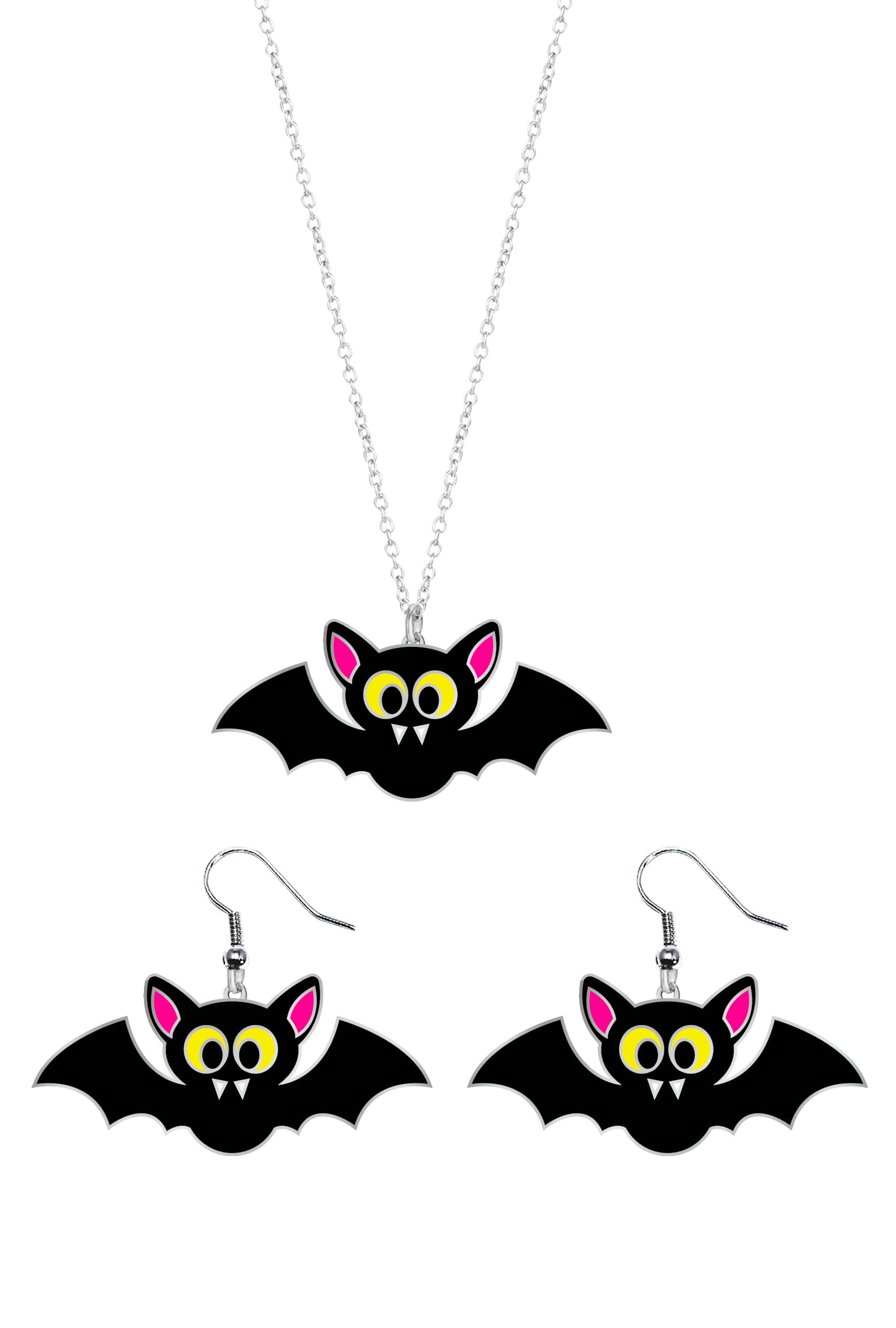 Uzupełnij swój strój na Halloween tym zestawem akcesoriów składającym się z naszyjnika i kolczyków w kształcie nietoperza. Wykonana z wytrzymałego metalu biżuteria jest trwała i doda eleganckiego, a jednocześnie upiornego akcentu do Twojego wyglądu