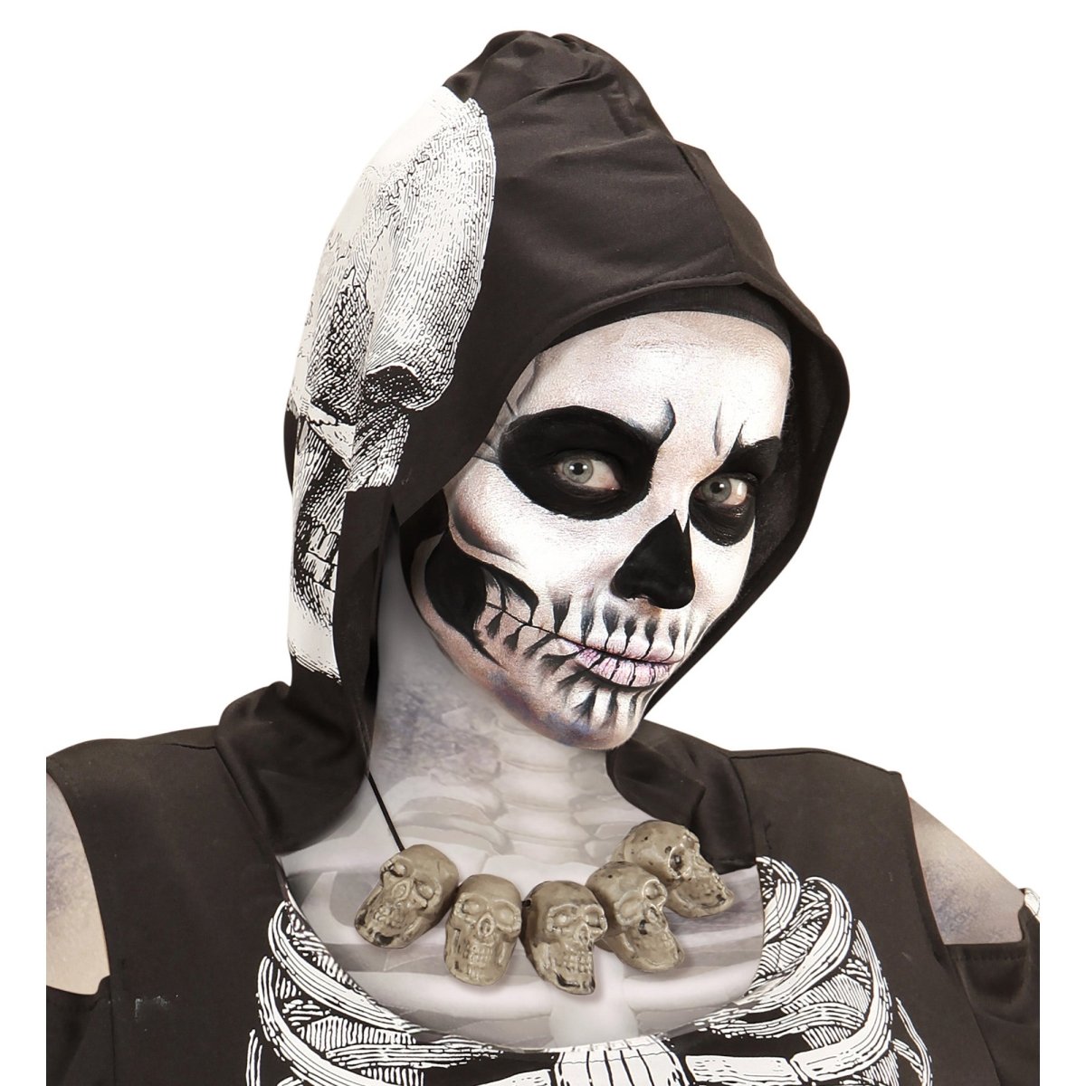 Uzupełnij swój strój na Halloween tym przyciągającym wzrok srebrnym naszyjnikiem ozdobionym czaszkami. Idealny na przerażające imprezy kostiumowe, imprezy tematyczne lub jako przyciągający wzrok dodatek podczas Halloween.