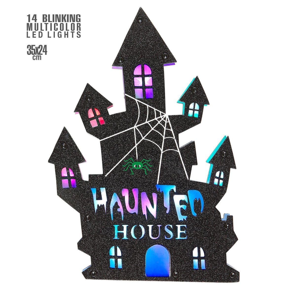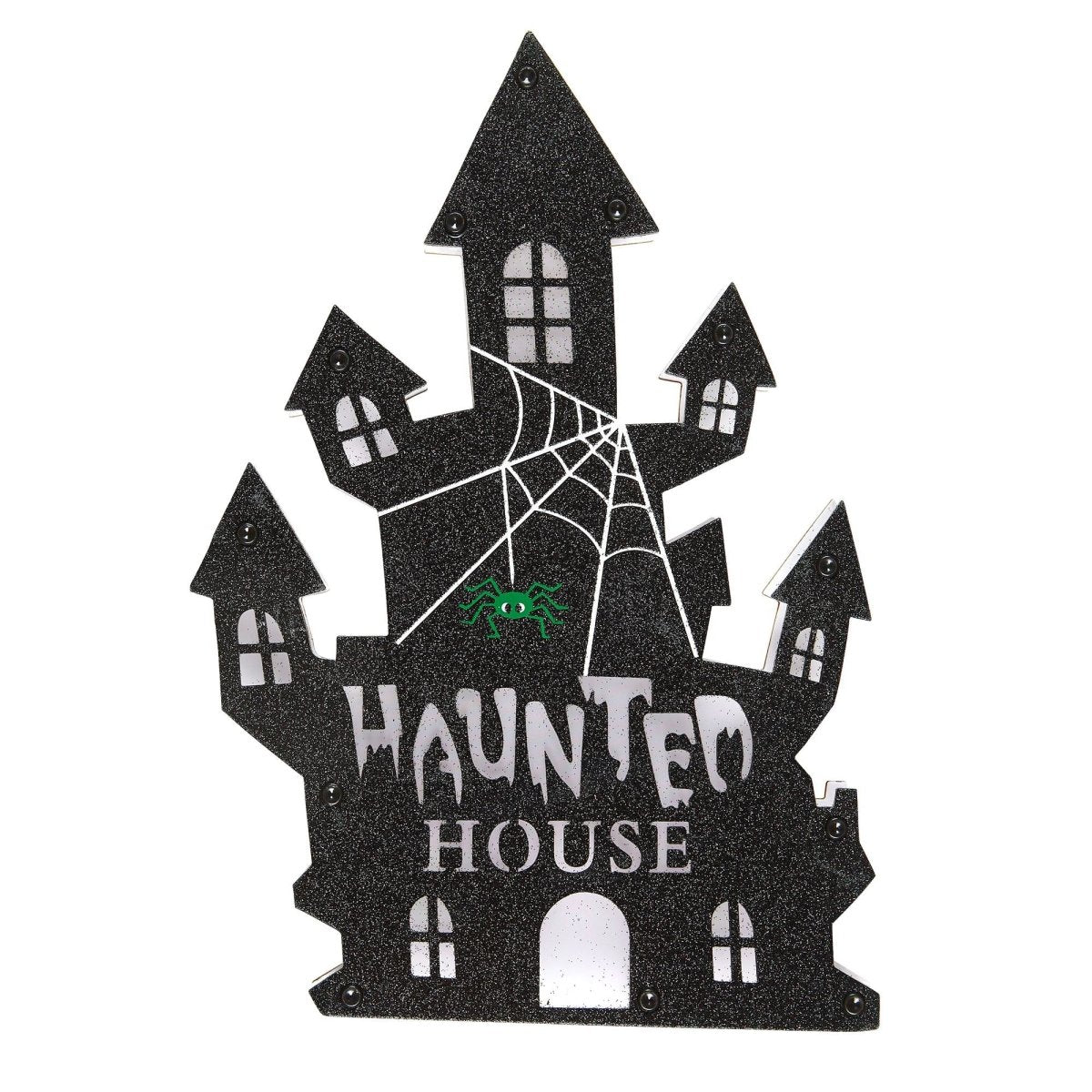 Halloweenowy znak na drzwi Nawiedzony dom ze światłem