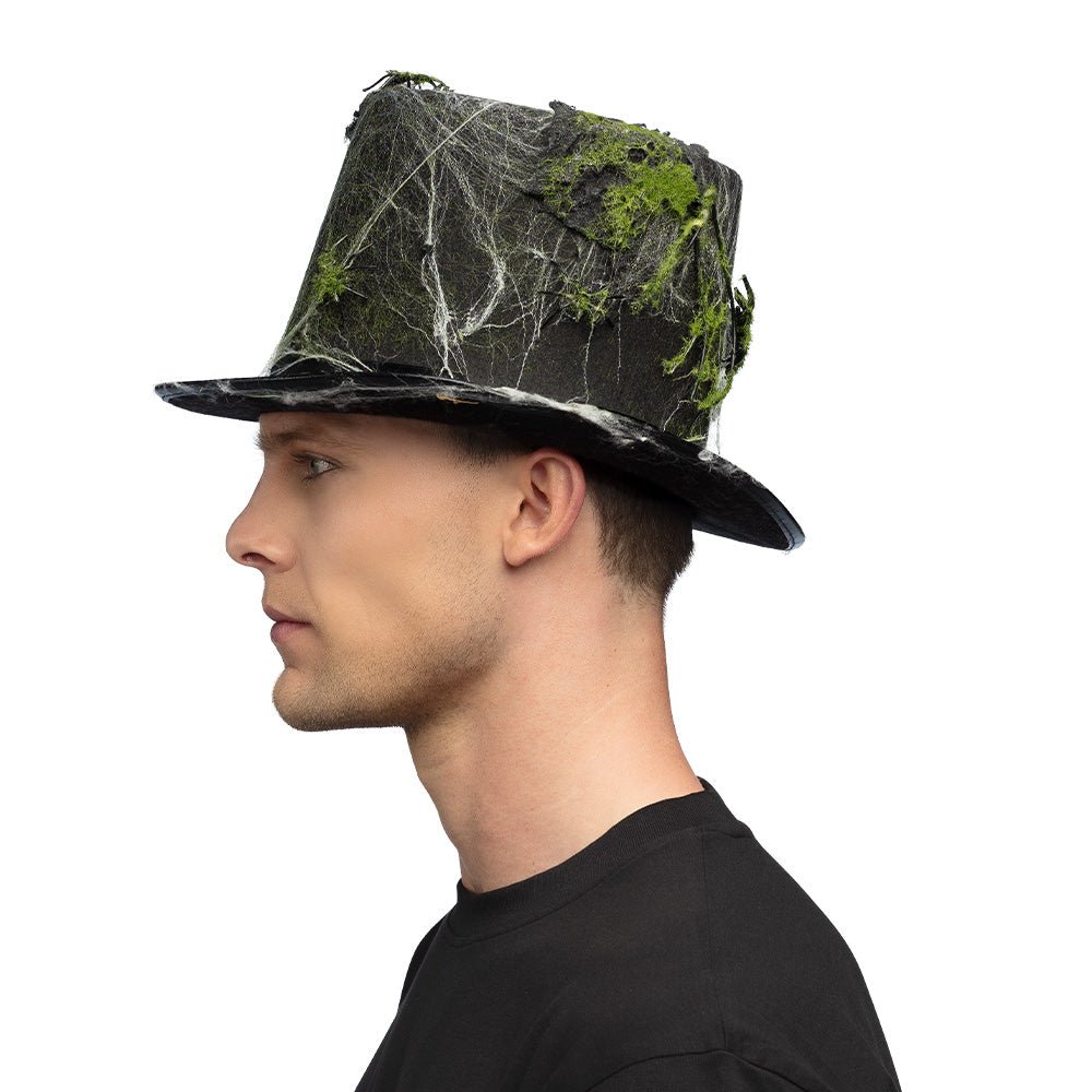 Z pajęczynami, akcentami mchu i zwietrzałym wyglądem, ten kapelusz wygląda jak wyciągnięty prosto z upiornego bagna. W połączeniu z mrocznym kostiumem zombie lub przerażającym strojem maga, ten kapelusz tworzy idealny złowieszczy wygląd. Niezbędny na każdej imprezie Halloween, paradzie cukierek albo psikus lub w nawiedzonym domu.