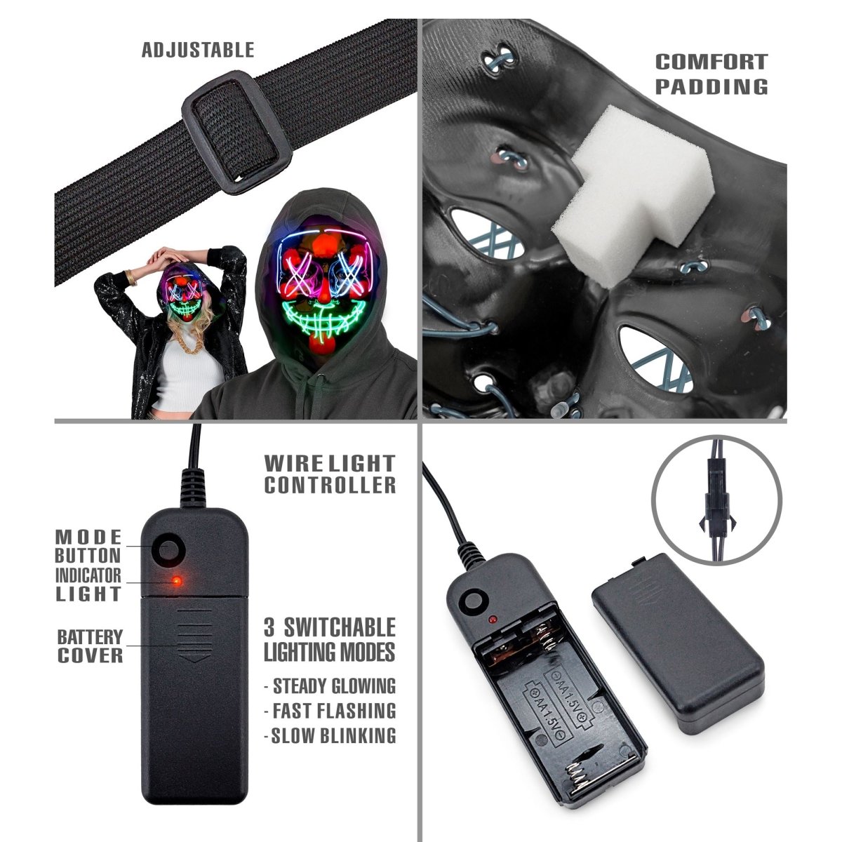 Wyróżnij swój wygląd i stwórz upiorną atmosferę dzięki tej czarnej masce z kolorowym neonowym światłem.