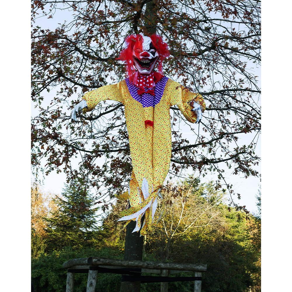 Spraw, by Twoja impreza Halloween była niezapomniana dzięki tej gigantycznej 3,5-metrowej lalce klauna. Dzięki jaskrawemu strojowi, przerażającemu uśmiechowi i dzikim rudym włosom, ta przerażająca dekoracja przyciąga wzrok. Zawieś ją na drzewie, przy drzwiach wejściowych lub w nawiedzonym domu i przestrasz wszystkich jak diabli.