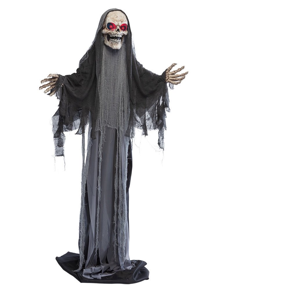 Ten przerażający ponury żniwiarz to idealna dekoracja na Halloween, która przyprawi wszystkich o ciarki. Oprócz przerażającego wyglądu i świecących czerwonych oczu, ta naturalnej wielkości lalka ożywa, gdy tylko w pobliżu pojawi się ruch. Po aktywacji ta lalka ponurego żniwiarza wywołuje koszmary swoimi przerażającymi dźwiękami i rośnie od 180 cm do maksymalnie 215 cm, co czyni ją jeszcze bardziej przerażającą! Prawdziwa dekoracja obowiązkowa dla nawiedzonych domów i imprez Halloween.