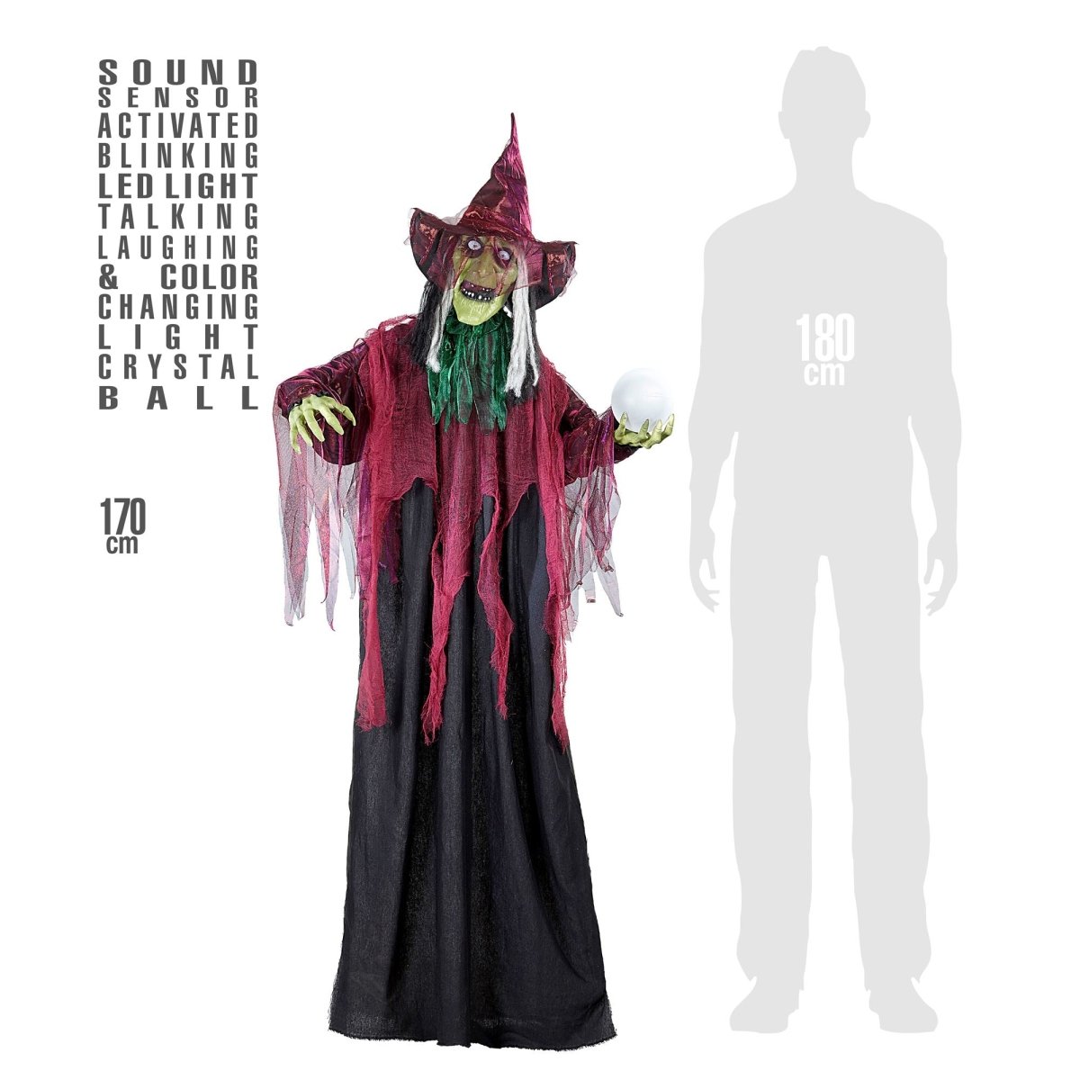 Dodaj upiorny i kultowy akcent do swoich dekoracji na Halloween dzięki tej Halloweenowej lalce czarownicy ze światłem i dźwiękiem. Idealna do stworzenia przerażającej atmosfery podczas Halloween w Twoim domu lub ogrodzie.