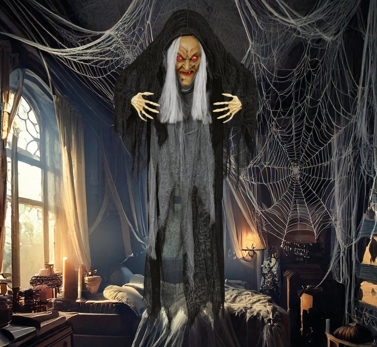 Halloweenowa lalka czarownica ze światłem, dźwiękiem i ruchem 1,20 m