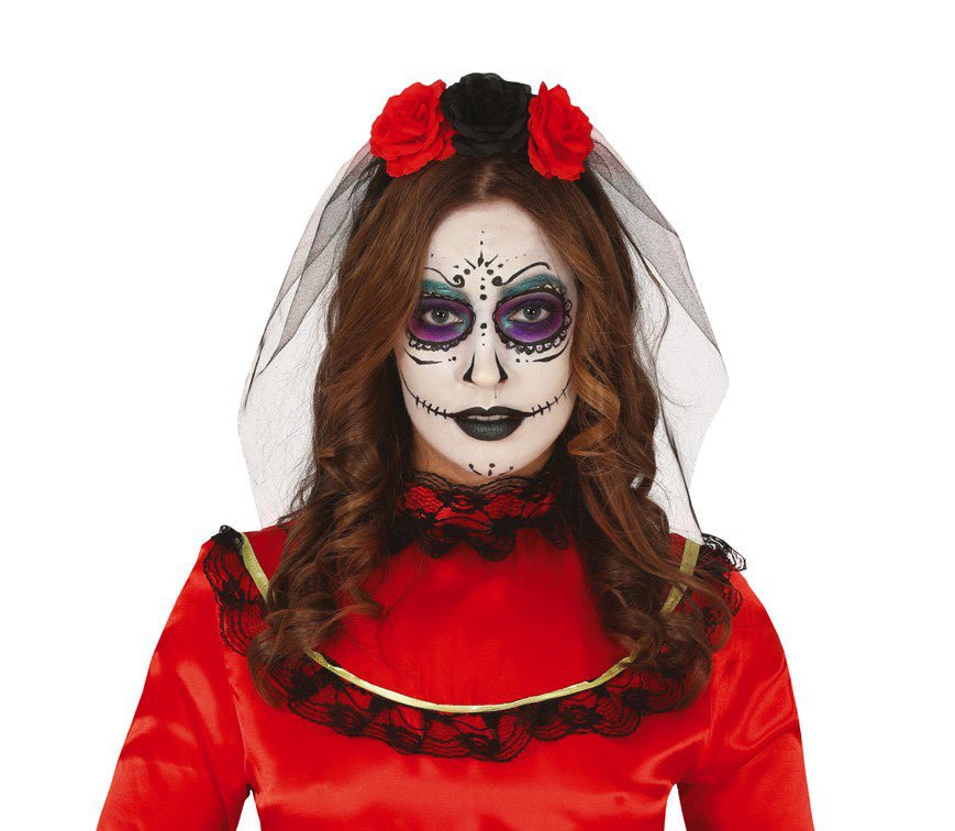 Halloweenowa tiara z welonem i kwiatami czerwona
