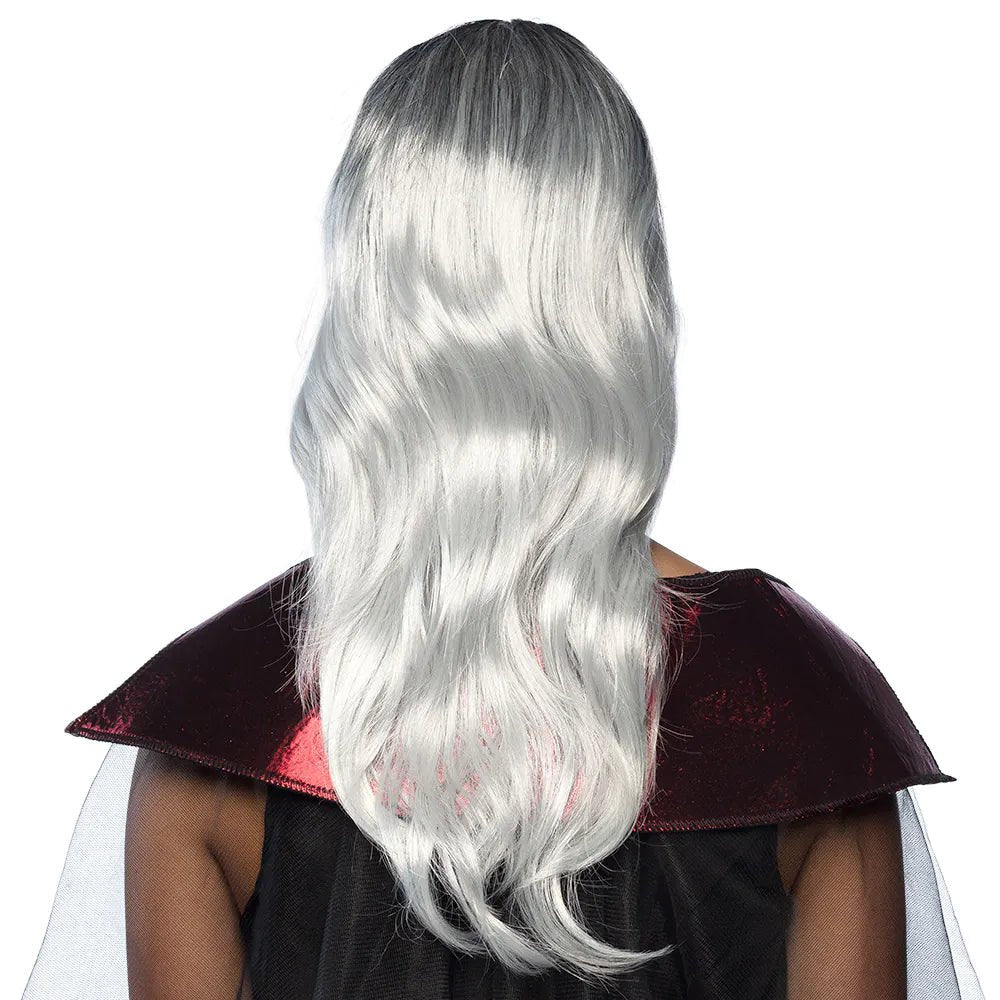 Piękna gotycka peruka damska z długimi kręconymi włosami i grzywką. Peruka ma biało-szary kolor, który nadaje jej mroczny wygląd, dzięki czemu może być idealnym uzupełnieniem przerażającego i seksownego kostiumu wampira na Halloween.