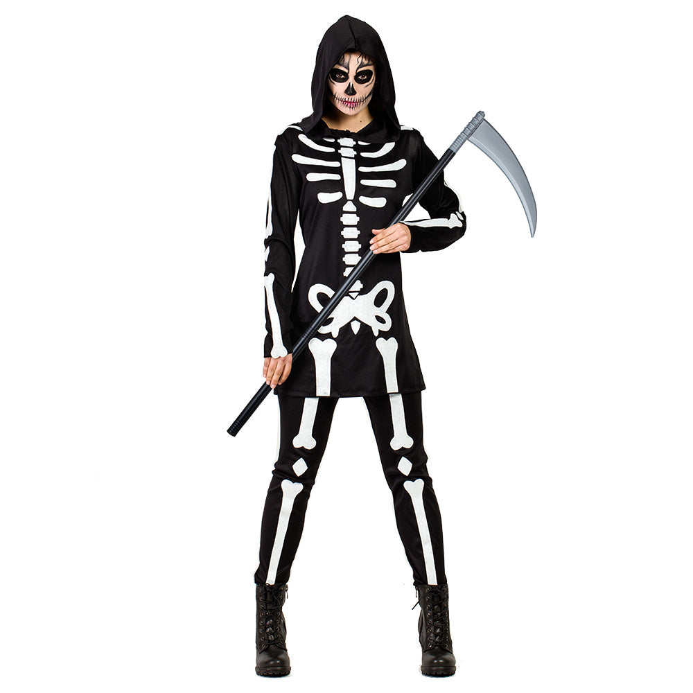 Ten fajny dwuczęściowy kostium szkieletu dla kobiet przekształci Cię w przerażającego szkieletora lub ponurego żniwiarza. Kostium na Halloween, obejmujący wygodną bluzę z długim rękawem i kapturem z dopasowanymi legginsami, doskonale łączy przerażające wibracje szkieletu z twardym wyglądem. Obie części są ozdobione białym nadrukiem kości. Dzięki wygodnemu dopasowaniu i przerażającemu wyglądowi, ten kostium jest idealny na imprezy Halloween, cosplay i/lub imprezy tematyczne oraz wieczory cukierek albo psikus.